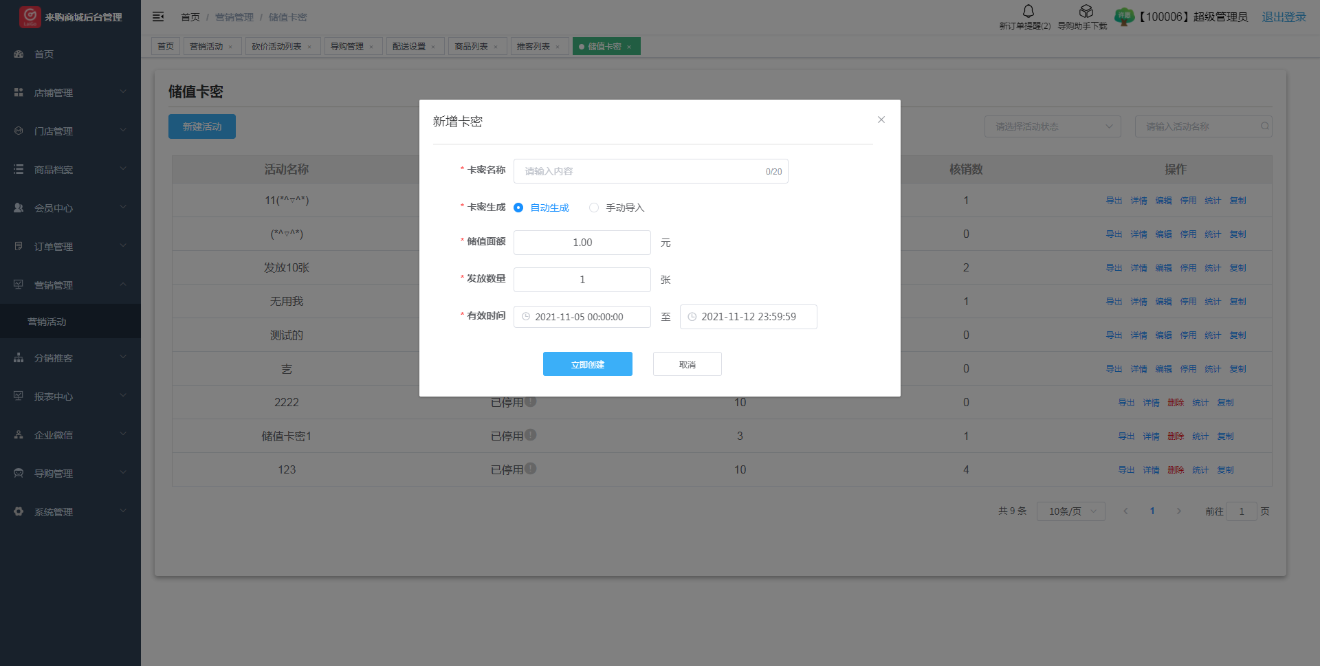 門(mén)店可以制作一些禮品卡和其它的公司合作,用于發(fā)放員工福利,或者抽獎(jiǎng)福利等。卡面的金額可自定義,收到禮品卡的人在門(mén)店來(lái)購(gòu)商城顧客端輸入卡面密碼即可充值到余額里,在商城里可任意消費(fèi)。▼ 制作禮品卡后臺(tái)界面