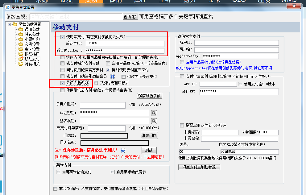 以智云系統(tǒng)為示例,打開后臺(tái)的“零售參數(shù)設(shè)置”--“移動(dòng)支付”--開啟“使用威支付”的參數(shù)并填寫威支付ID和威支付apikey,填寫完后,再把下面的“會(huì)員人臉識(shí)別”參數(shù)打開。