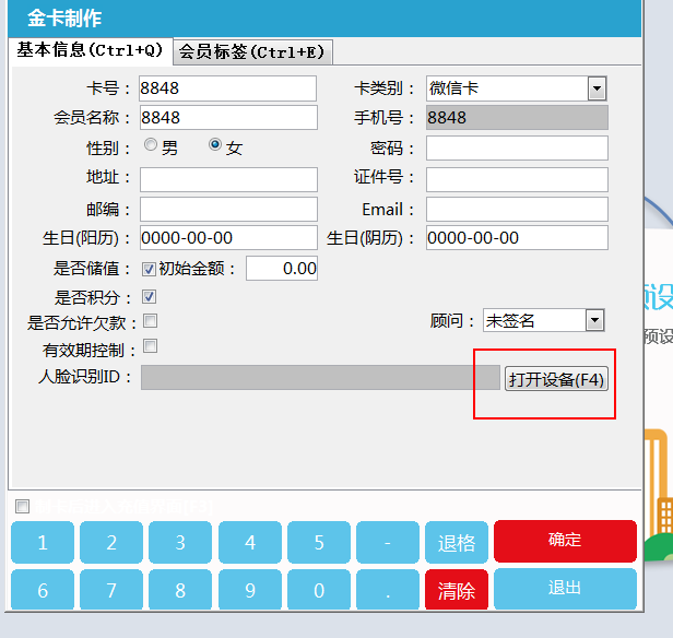 給會(huì)員制卡、發(fā)卡時(shí)先采集會(huì)員的人臉,打開后臺(tái)“金卡制作”--“基本信息”--“打開設(shè)備”。
