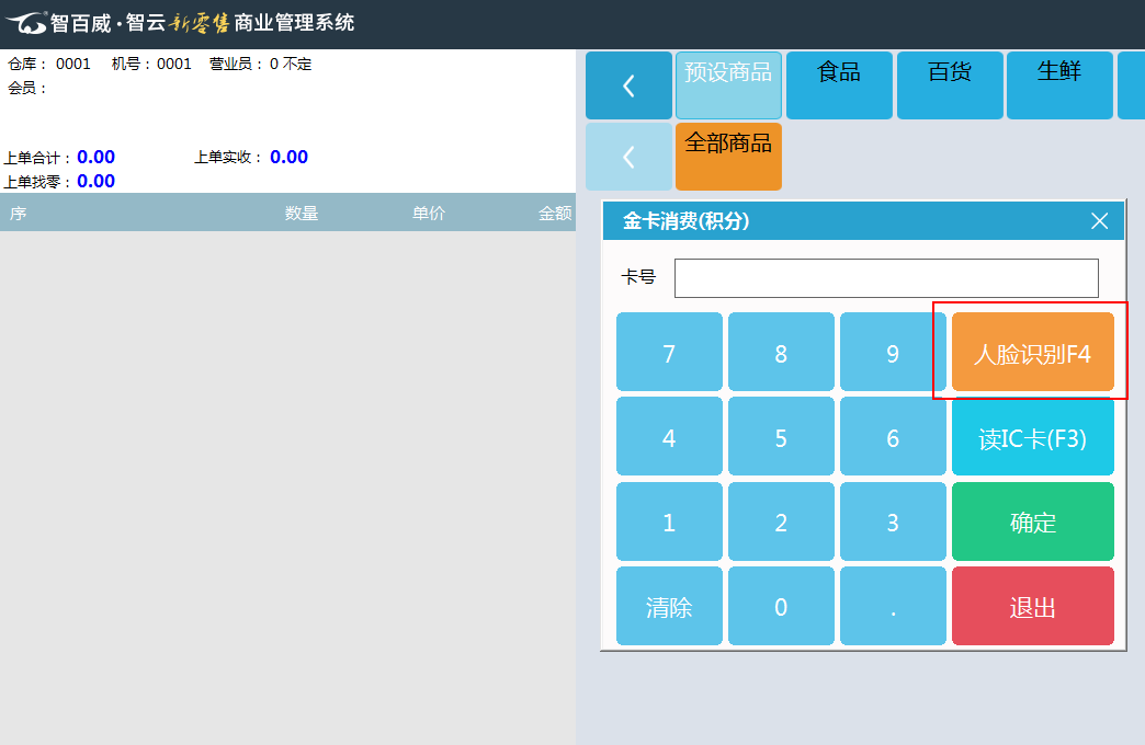 前臺(tái)收銀員直接按“F2”調(diào)出金卡消費(fèi)的窗口,再按”F4“人臉識(shí)別,會(huì)員則可以刷臉支付購(gòu)物了。
