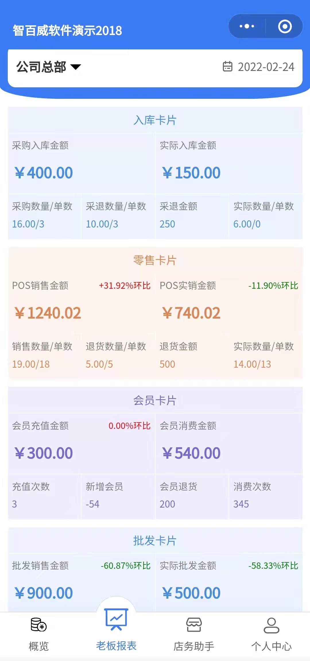 進(jìn)入店賬通Pro則能看到企業(yè)整體營(yíng)業(yè)數(shù)據(jù)概覽;在經(jīng)營(yíng)日?qǐng)?bào)里能直觀看到入庫、零售、會(huì)員、批發(fā)相關(guān)數(shù)據(jù)。