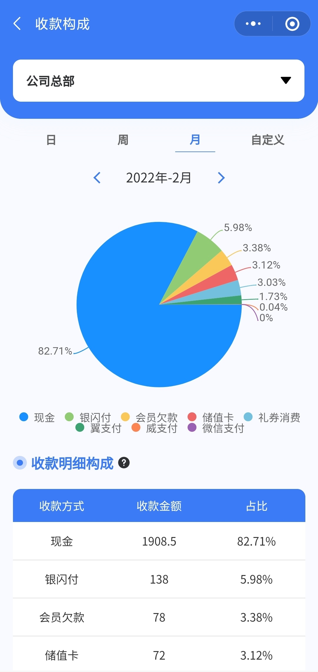 店賬通Pro提供收款構(gòu)成、營(yíng)業(yè)額構(gòu)成分析,收銀對(duì)賬、收銀異常依據(jù)等。