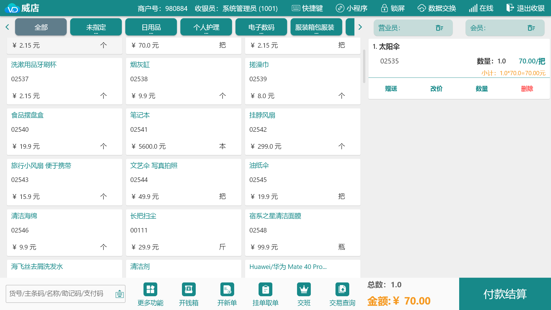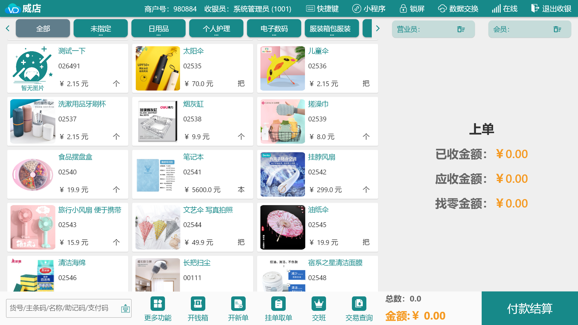 前臺支持觸摸點(diǎn)選商品結(jié)算,商品顯示在左邊界面,可根據(jù)類別篩選商品,快速點(diǎn)單收銀