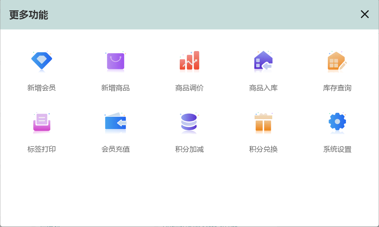 前臺收銀界面可直接調(diào)出店務(wù)處理,可處理新增會員、新增商品、商品調(diào)價(jià)、商品入庫、庫存查詢、標(biāo)簽打印、會員充值、積分加減、積分兌換、系統(tǒng)設(shè)置等店務(wù)