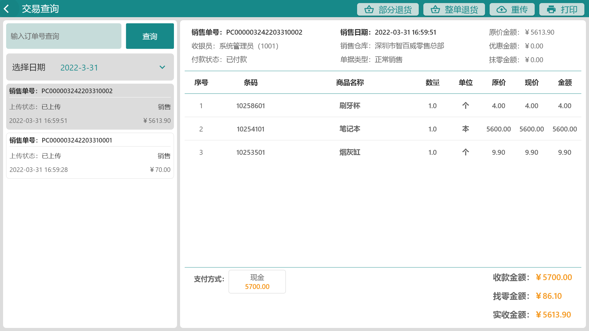 交易流水實(shí)時(shí)查詢,直接在前臺界面調(diào)出“交易查詢”即可查詢收銀流水?dāng)?shù)據(jù)