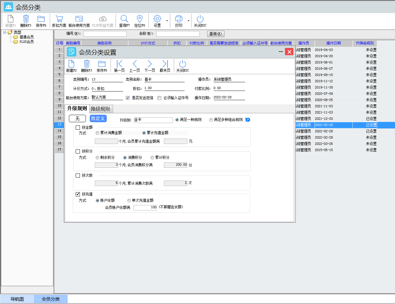 使用場(chǎng)景一:如下圖,普卡會(huì)員類別在達(dá)到單次充值金額超過100元時(shí),則該會(huì)員類別下滿足條件的卡會(huì)升級(jí)到金卡會(huì)員類別