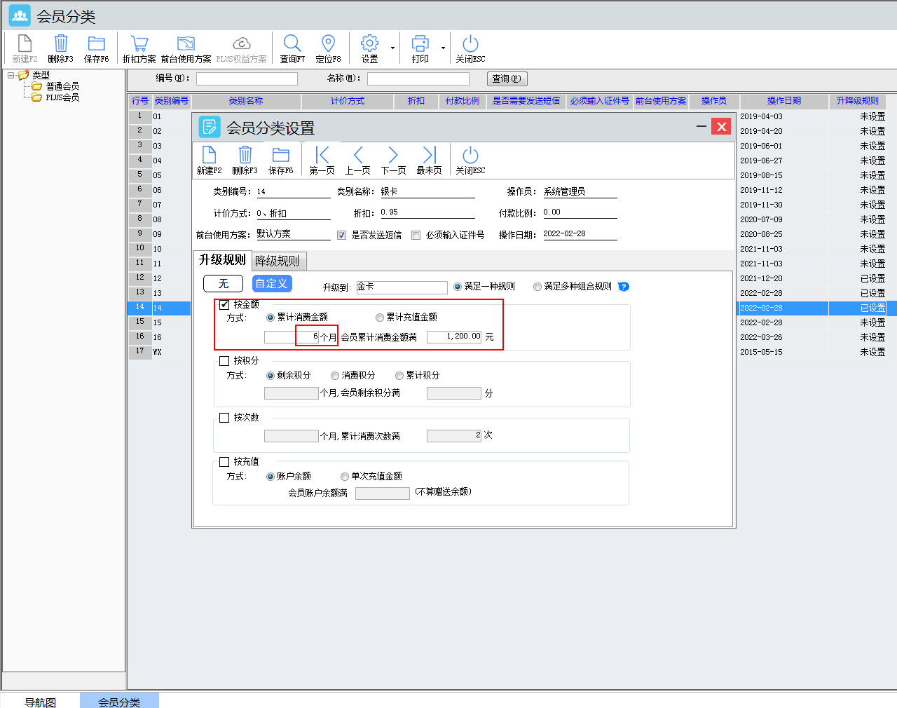 使用場(chǎng)景二:如下圖,銀卡會(huì)員類別在6個(gè)月期限內(nèi)的累計(jì)消費(fèi)金額達(dá)到1200元,則會(huì)升級(jí)到金卡會(huì)員類別