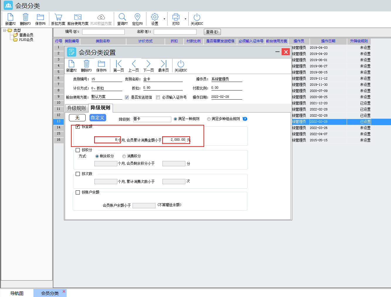 使用場(chǎng)景:如下圖,當(dāng)金卡類別在8個(gè)月期限,會(huì)員累計(jì)消費(fèi)金額小于2000元時(shí),自動(dòng)降級(jí)為普卡