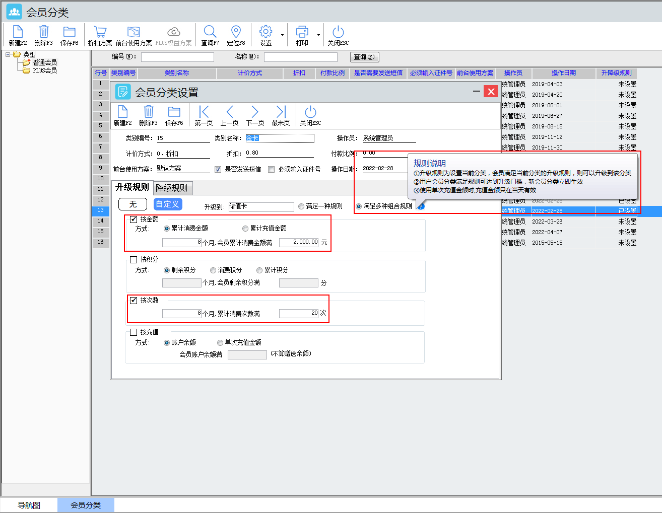 使用場(chǎng)景:如下圖,需要同時(shí)滿足8個(gè)月期限會(huì)員累計(jì)消費(fèi)金額滿2000元、8個(gè)月期限會(huì)員累計(jì)消費(fèi)次數(shù)滿20次,才會(huì)進(jìn)行會(huì)員升級(jí),降級(jí)也是同理。