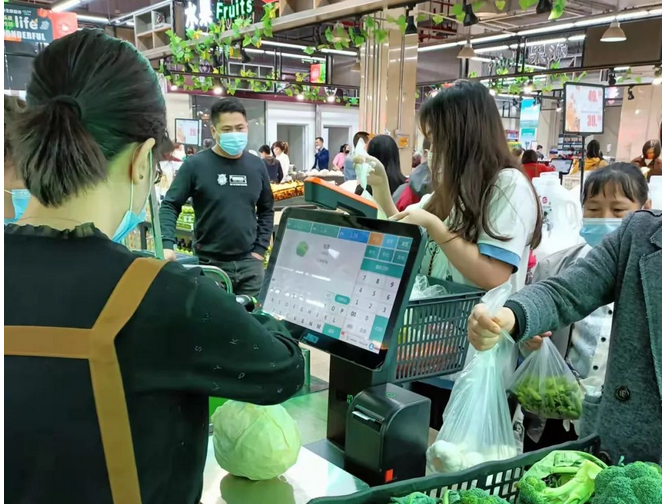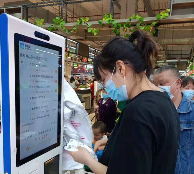 在百多升生鮮超市盡顯科技便利,商品旁邊的價(jià)格顯示屏、貨架里商品智能計(jì)算補(bǔ)貨時(shí)間、打秤處的智能稱重、超市結(jié)算通道里的自助收銀機(jī)、收銀臺里移動支付、人臉支付等等。