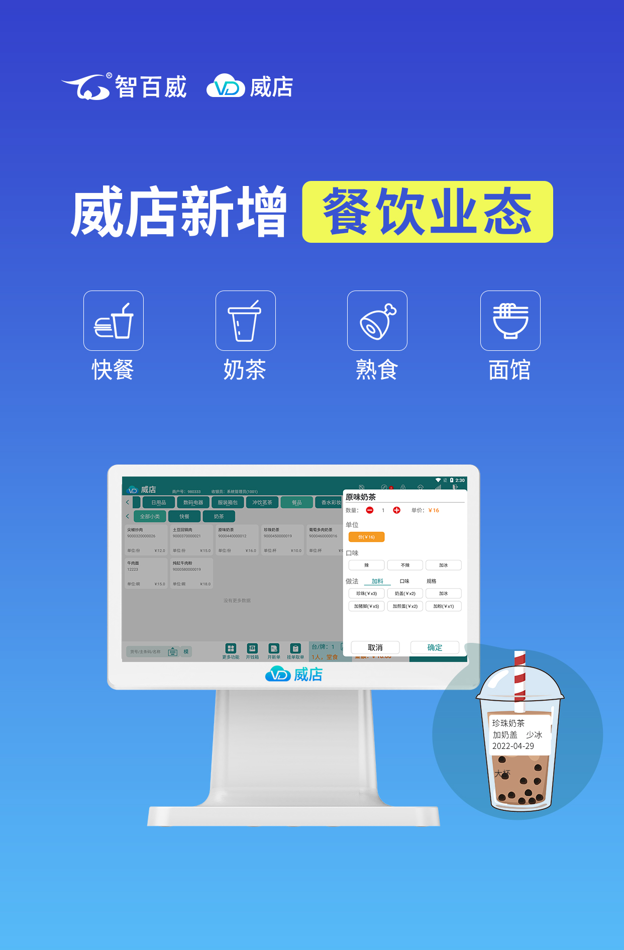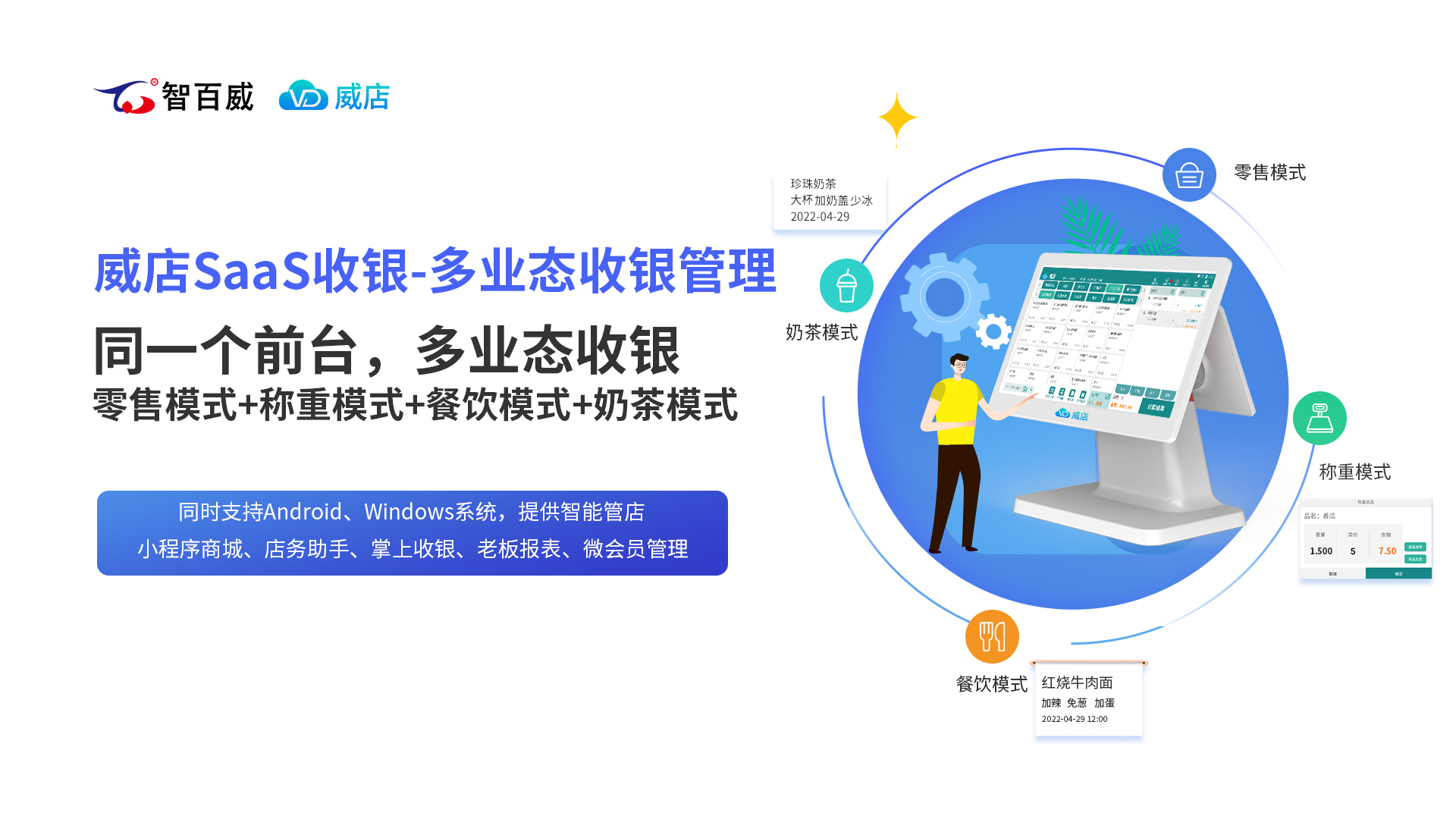 智百威威店SaaS收銀軟件,支持Android、Windows系統(tǒng)。一款產(chǎn)品可同時(shí)管理零售、餐飲、稱重、奶茶等業(yè)態(tài)。