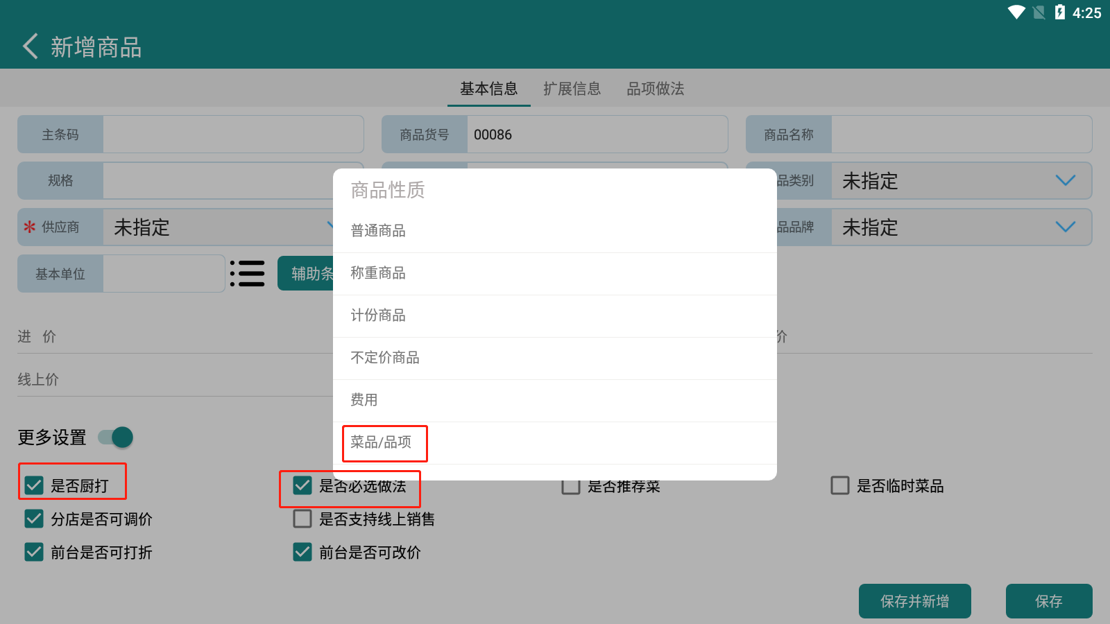 威店新增餐飲菜品管理,在系統(tǒng)后臺(tái)新增商品檔案時(shí)商品性質(zhì)里可選擇“菜品/品項(xiàng)”,以及可附加設(shè)置管理“是否廚打”“是否必選做法”等。