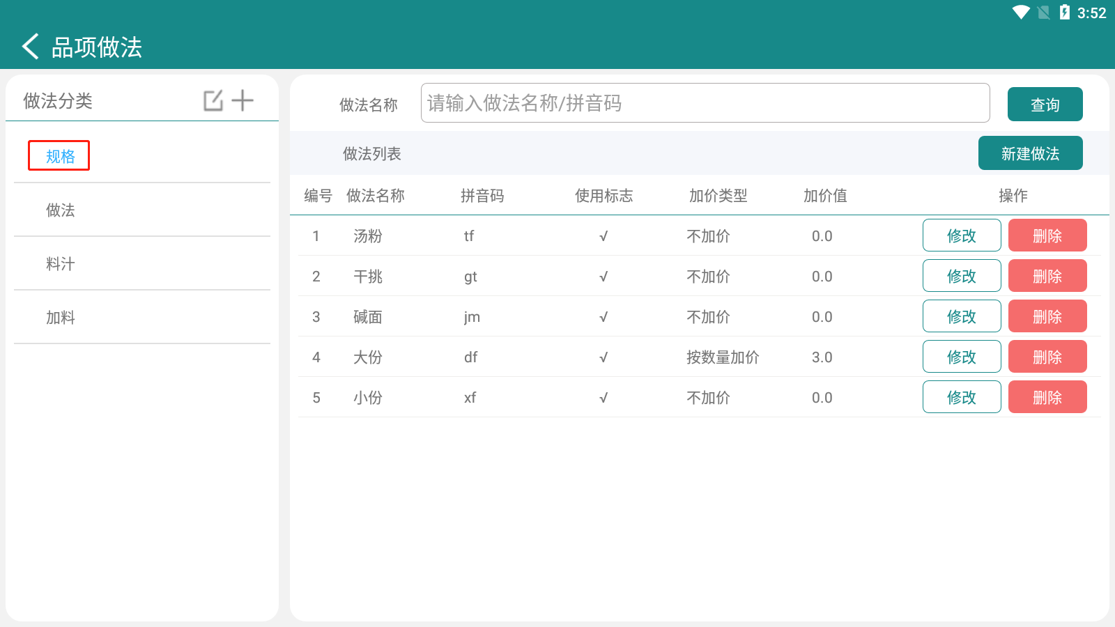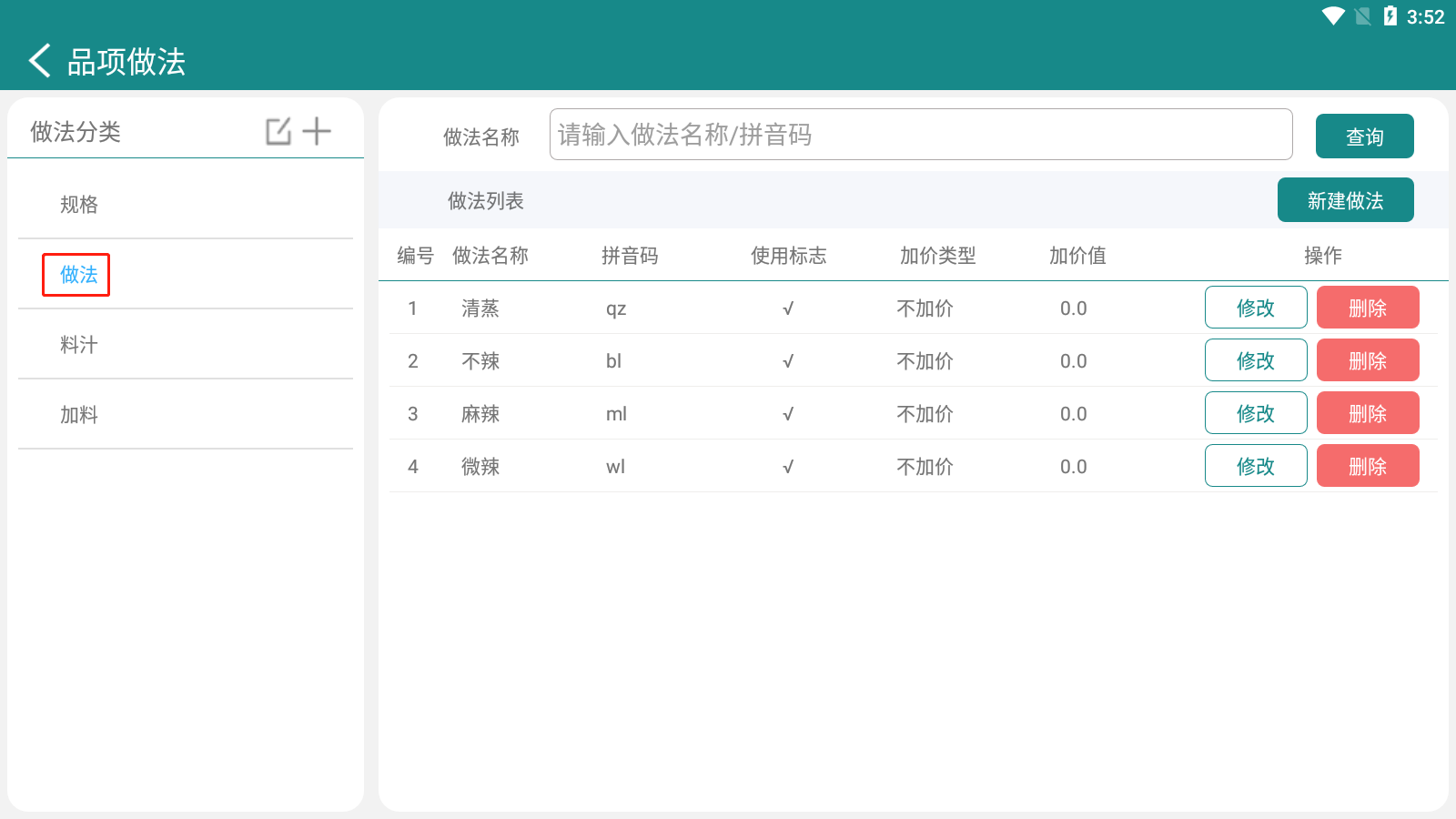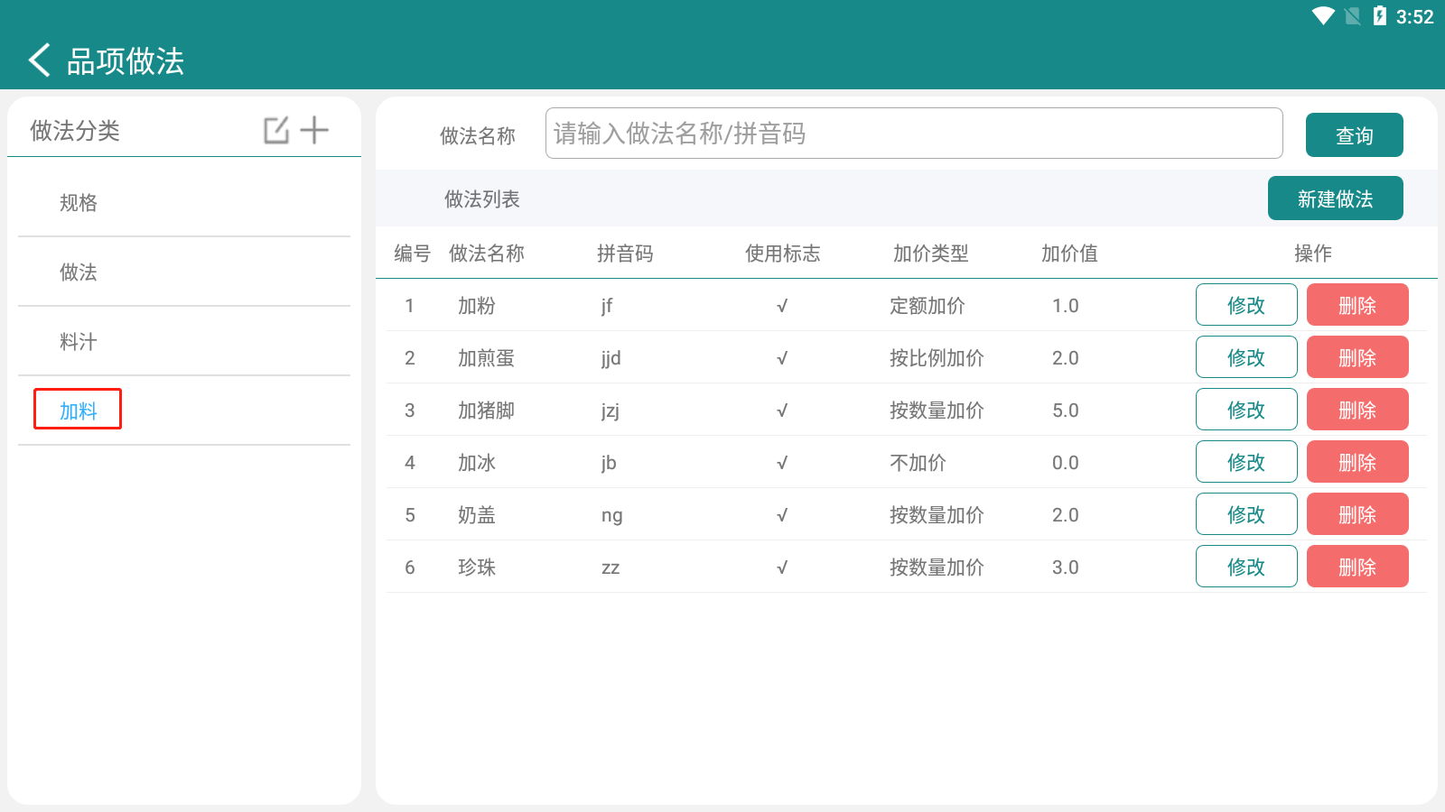 威店新增品項(xiàng)做法、品項(xiàng)口味管理。可增加規(guī)格、做法(口味)、加料管理等。