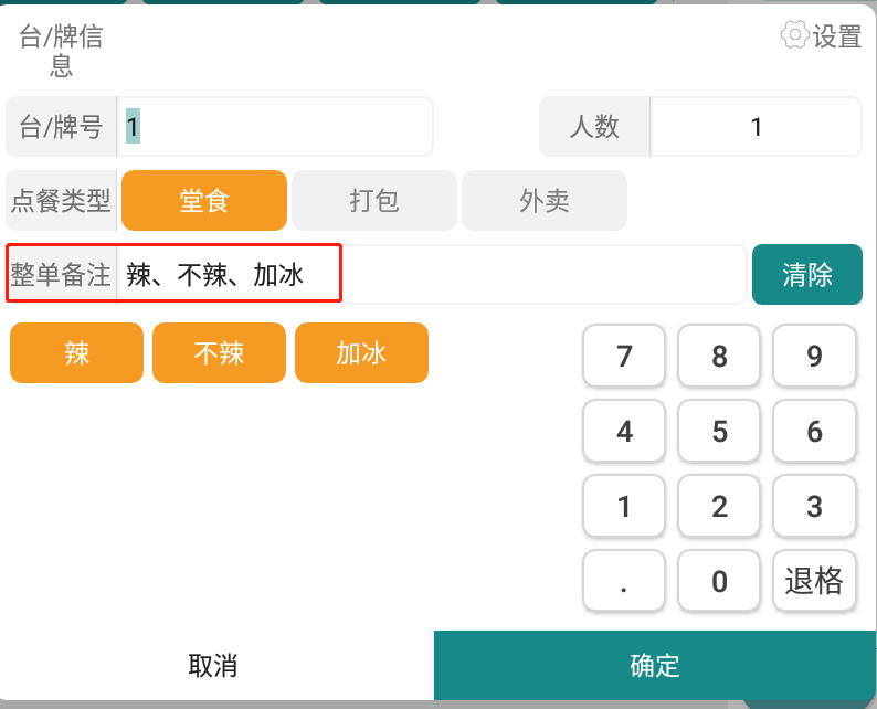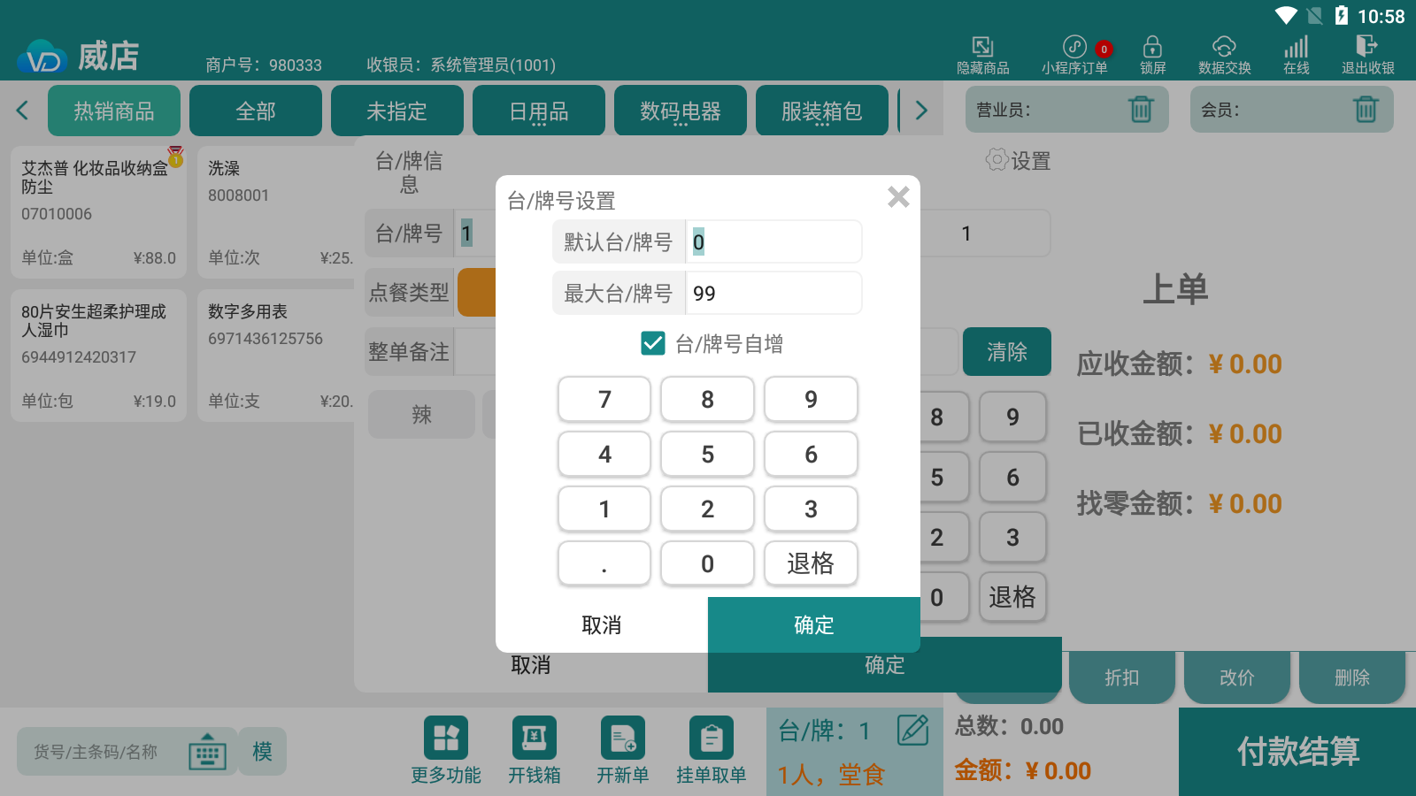 威店前臺(tái)支持堂食、打包點(diǎn)單,堂食的臺(tái)/牌號(hào)可自動(dòng)生成或由收銀員手動(dòng)輸入臺(tái)號(hào)。