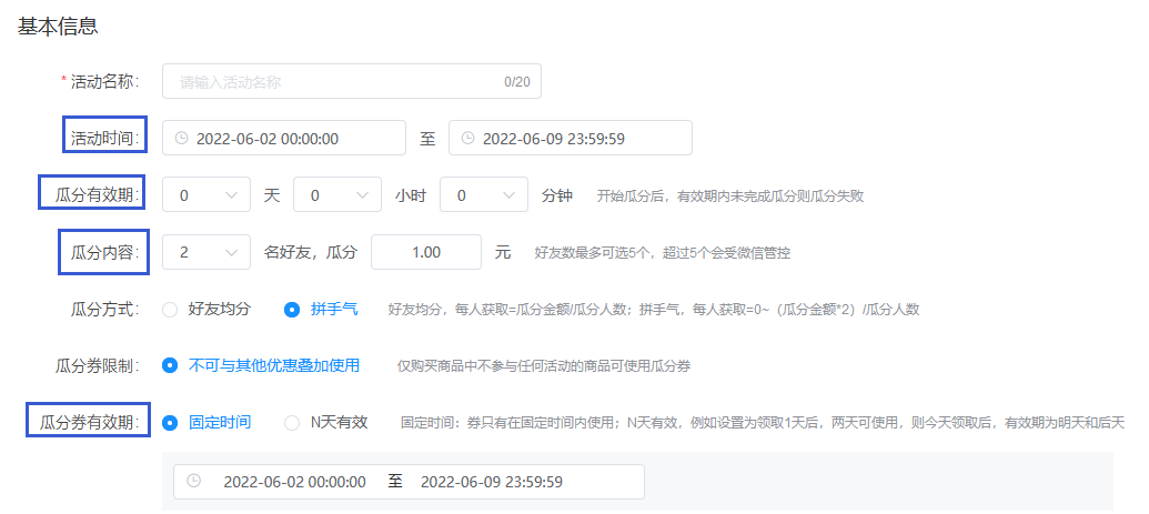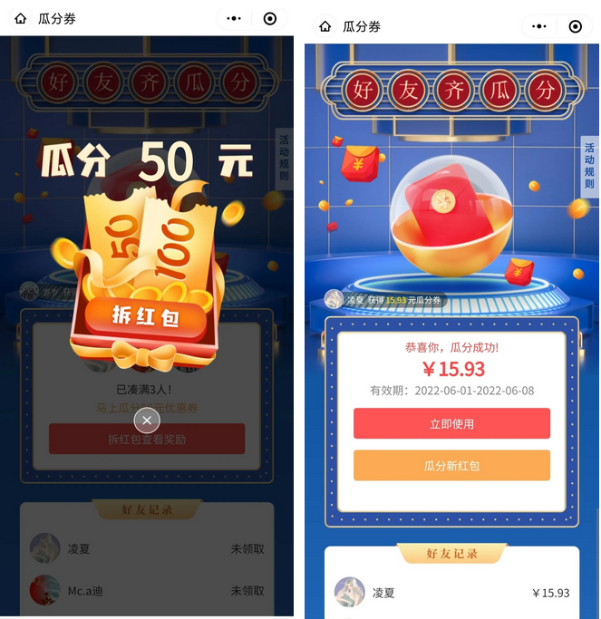 瓜分的有效期可自定義,超過(guò)時(shí)間沒(méi)有瓜分成功自動(dòng)失效。瓜分禮券的人數(shù)可控制2-5人一起瓜分金額。