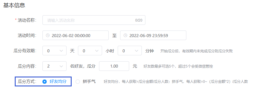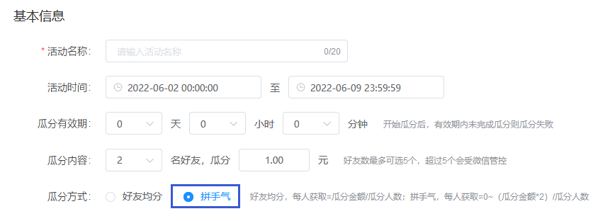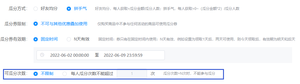活動(dòng)期內(nèi)可選擇不限制每人瓜分次數(shù),也可限制每人瓜分的次數(shù)。