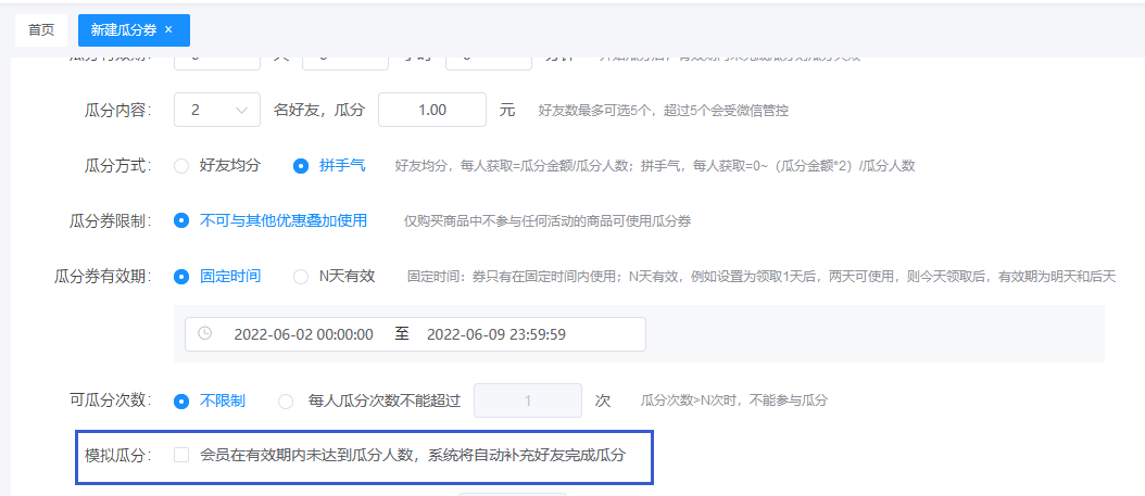 當(dāng)在有效期內(nèi)未達(dá)到瓜分人數(shù)條件時(shí),系統(tǒng)給予自動(dòng)補(bǔ)充好友瓜分完成,此參數(shù)可根據(jù)情況考慮是否開(kāi)啟。