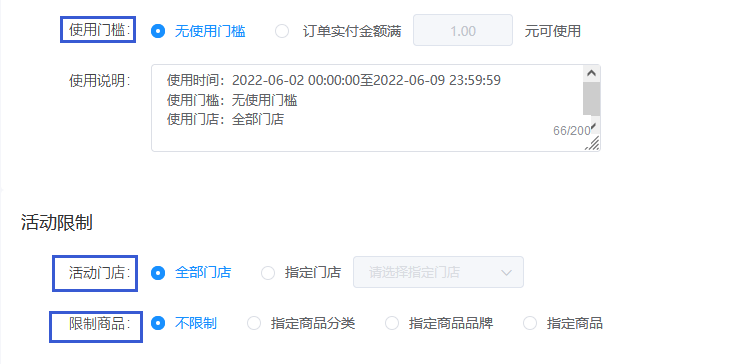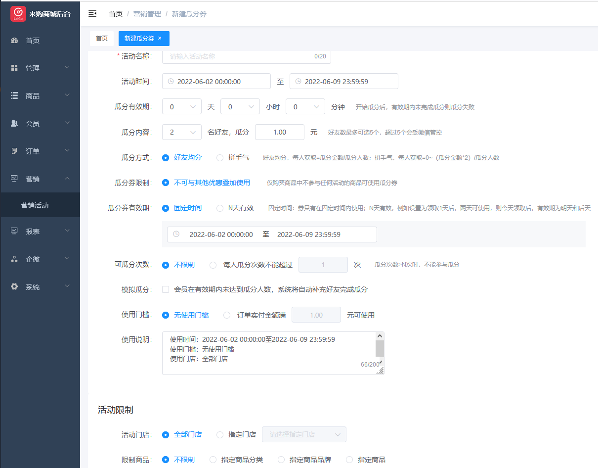 瓜分的禮券可選擇是否設(shè)定訂單金額核銷門檻,是否適用全部門店或只能用于指定門店;禮券可設(shè)置是否限制商品。