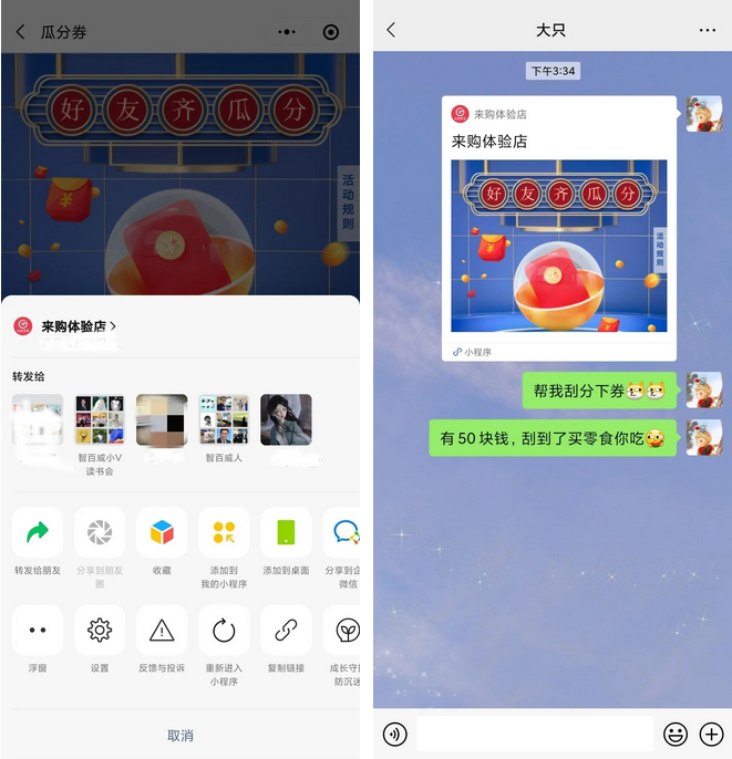 從商城活動(dòng)界面分享給好友,邀請(qǐng)好友一同瓜分禮券,活動(dòng)更易成功。主動(dòng)邀請(qǐng)好友瓜分券說(shuō)明是需要禮券,目的明確,核銷率高。