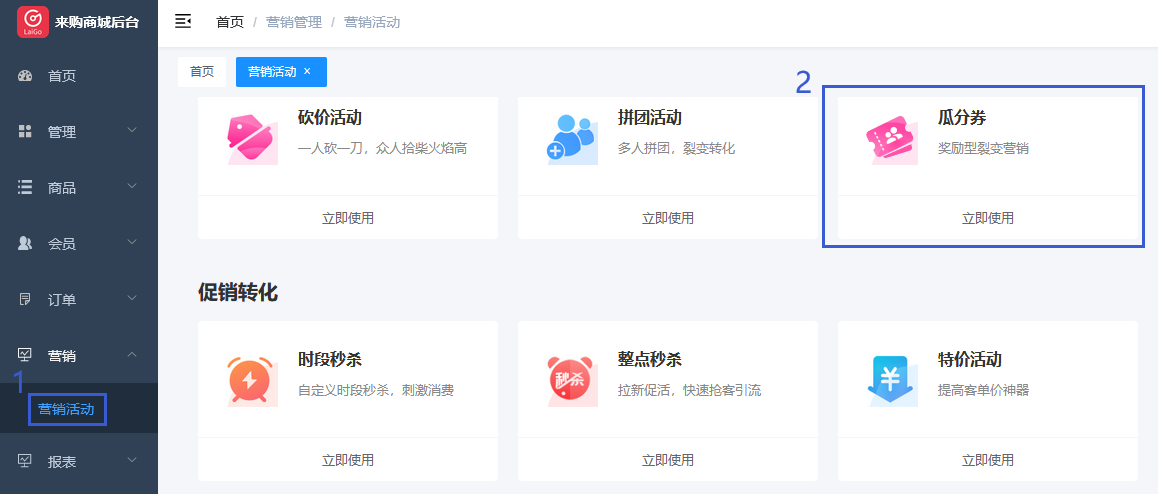 點(diǎn)擊來(lái)購(gòu)后臺(tái)側(cè)邊欄“營(yíng)銷活動(dòng)”--“裂變營(yíng)銷”--“瓜分券”