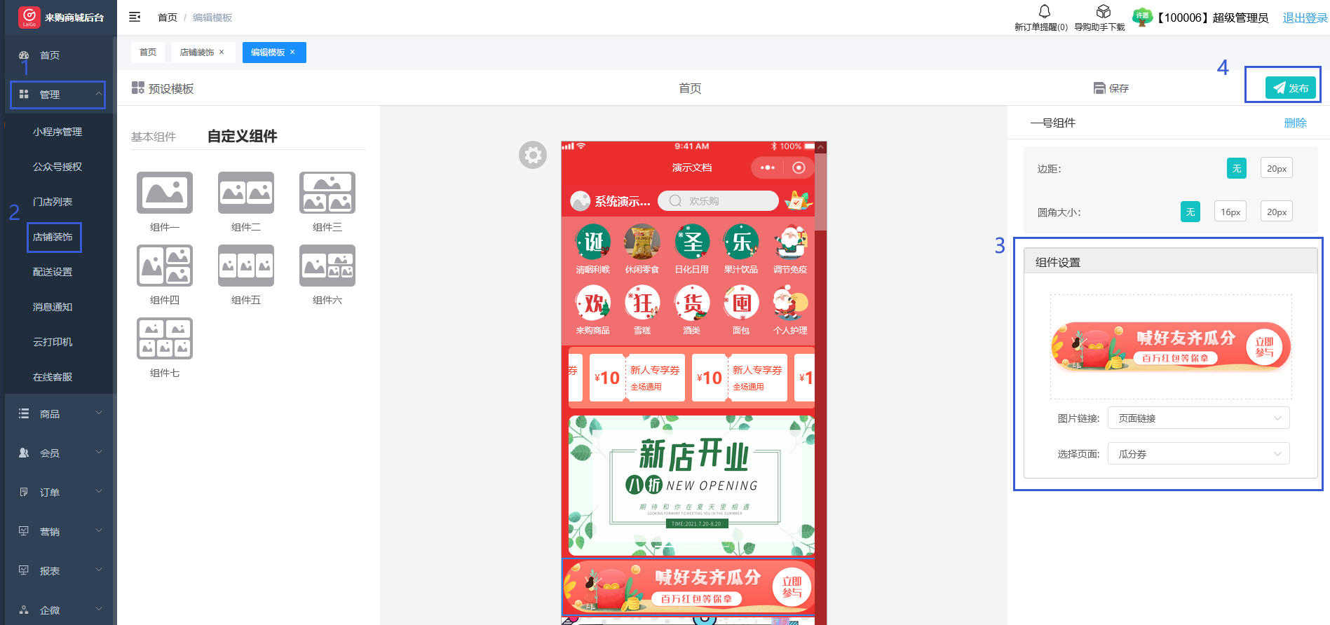 點(diǎn)擊來(lái)購(gòu)后臺(tái)側(cè)邊欄“管理”--“店鋪裝飾”--選擇“新建模版”或者“修改模版”替換現(xiàn)有的活動(dòng)