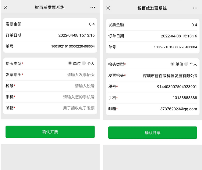 顧客掃描二維碼后填寫上相應(yīng)的開票信息,如公司名稱、稅號(hào)等,再填寫上收票郵箱,稍等片刻即可在郵箱里收到電子發(fā)票