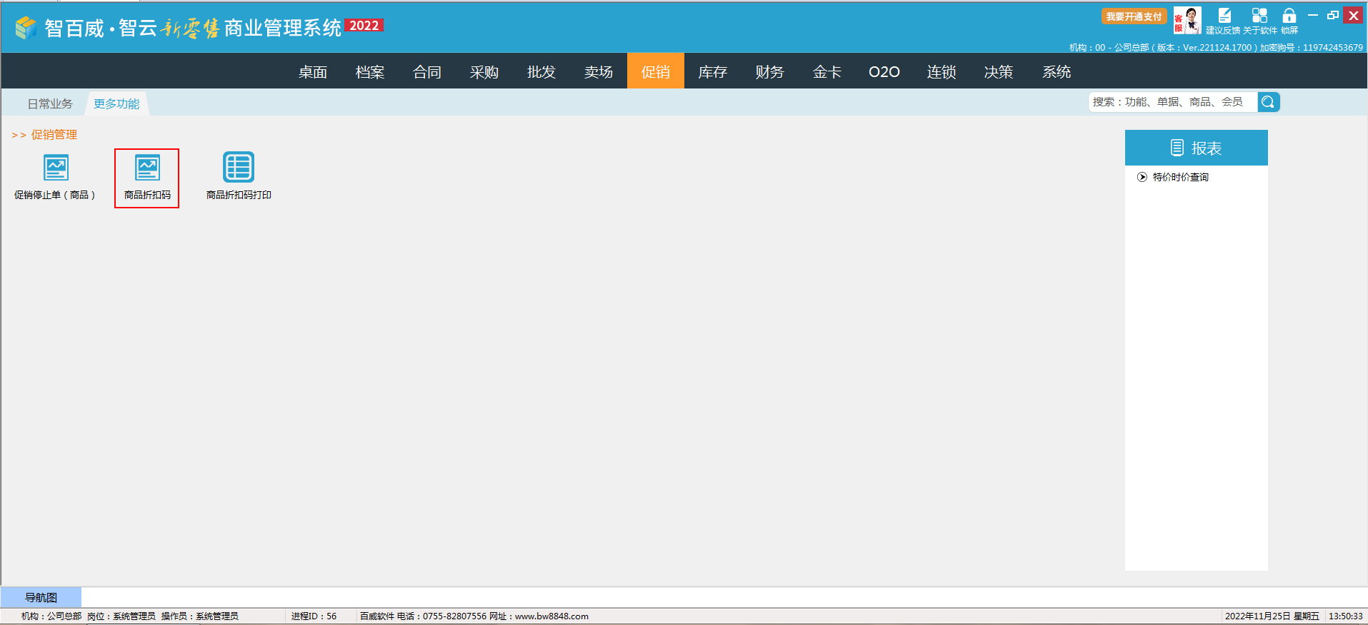 點(diǎn)擊單據(jù)頂部導(dǎo)航中的折扣碼打印,跳轉(zhuǎn)至商品折扣碼打印模塊,也可以通過‘促銷’-‘更多功能’選擇‘商品折扣碼打印’進(jìn)入模塊。