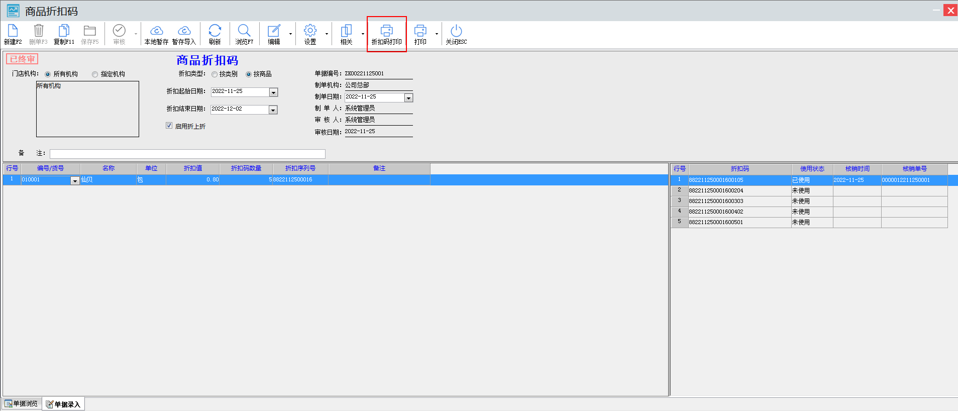 在單據(jù)左下的明細(xì)區(qū)域設(shè)置商品貨號(hào)/類別編號(hào)、折扣值、折扣碼數(shù)量,保存審核后,可在單據(jù)右下折扣碼區(qū)域看到相應(yīng)商品折扣碼。
