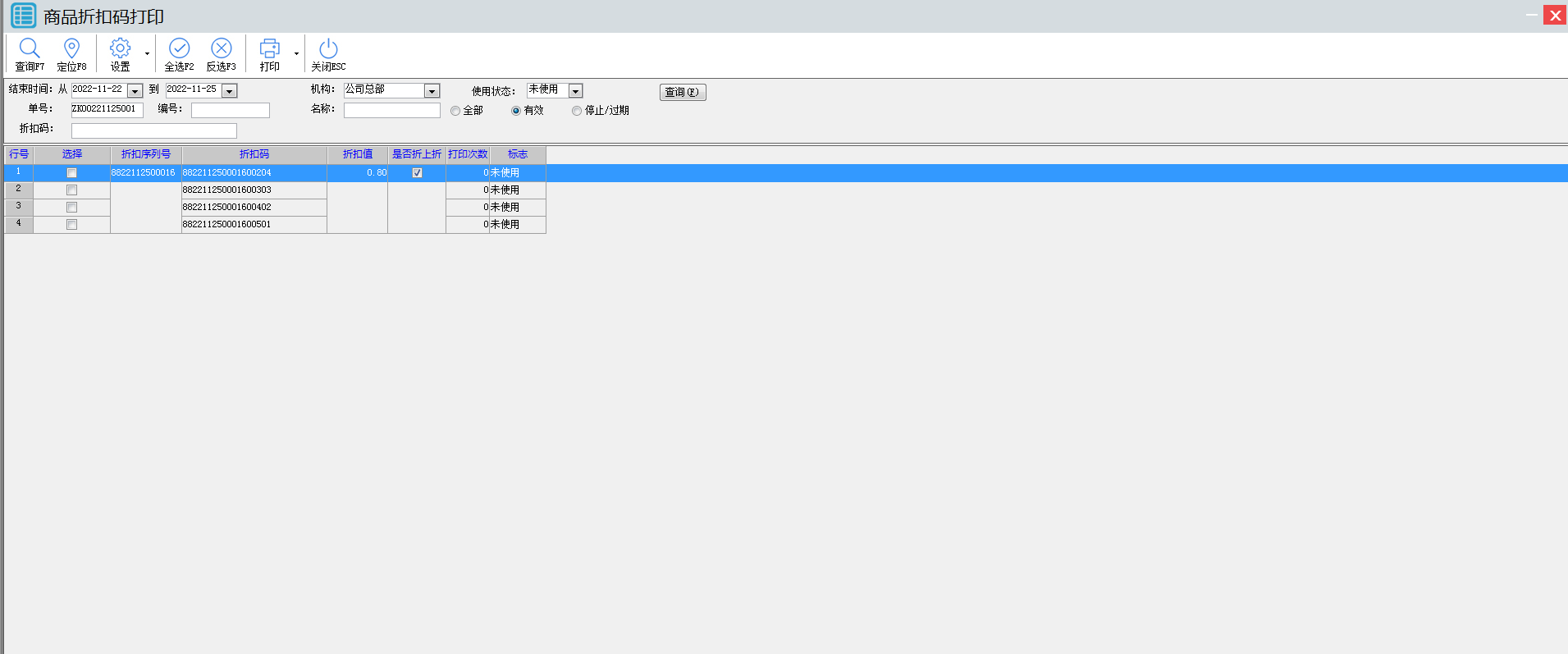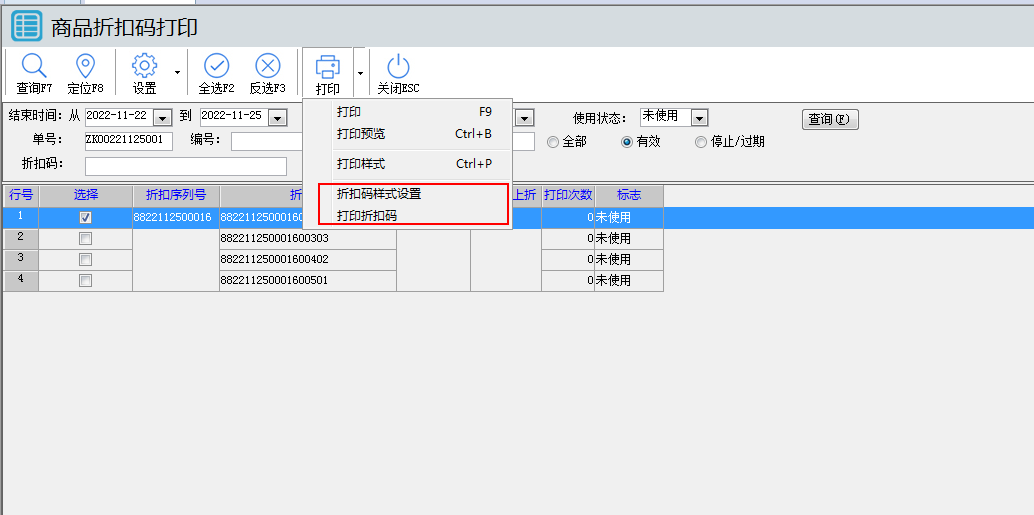 點(diǎn)擊頂部導(dǎo)航中的打印項(xiàng),可選擇下拉框中的打印折扣碼項(xiàng)進(jìn)行打印,也可以選擇折扣碼樣式設(shè)置自定義設(shè)置折扣碼樣式。