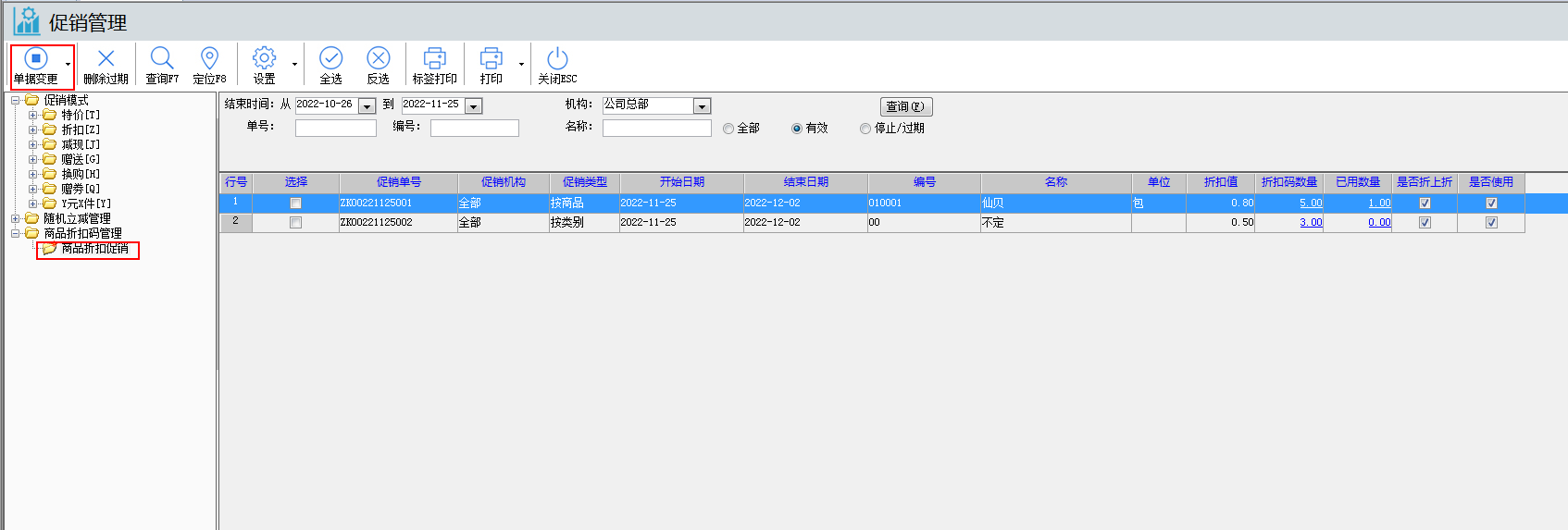 保存審核后的商品折扣碼單據(jù)可在‘促銷’選擇‘促銷管理’進(jìn)入模塊,選定左邊樹狀導(dǎo)航的商品折扣促銷查看。可勾選需要管理的商品折扣碼單據(jù)明細(xì),點(diǎn)擊頂部導(dǎo)航中的單據(jù)變更進(jìn)行停用或恢復(fù)。