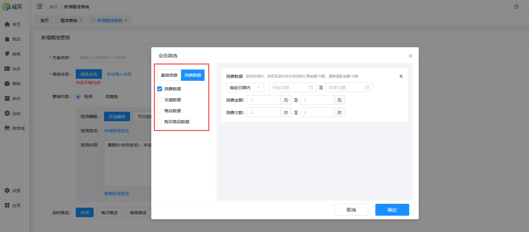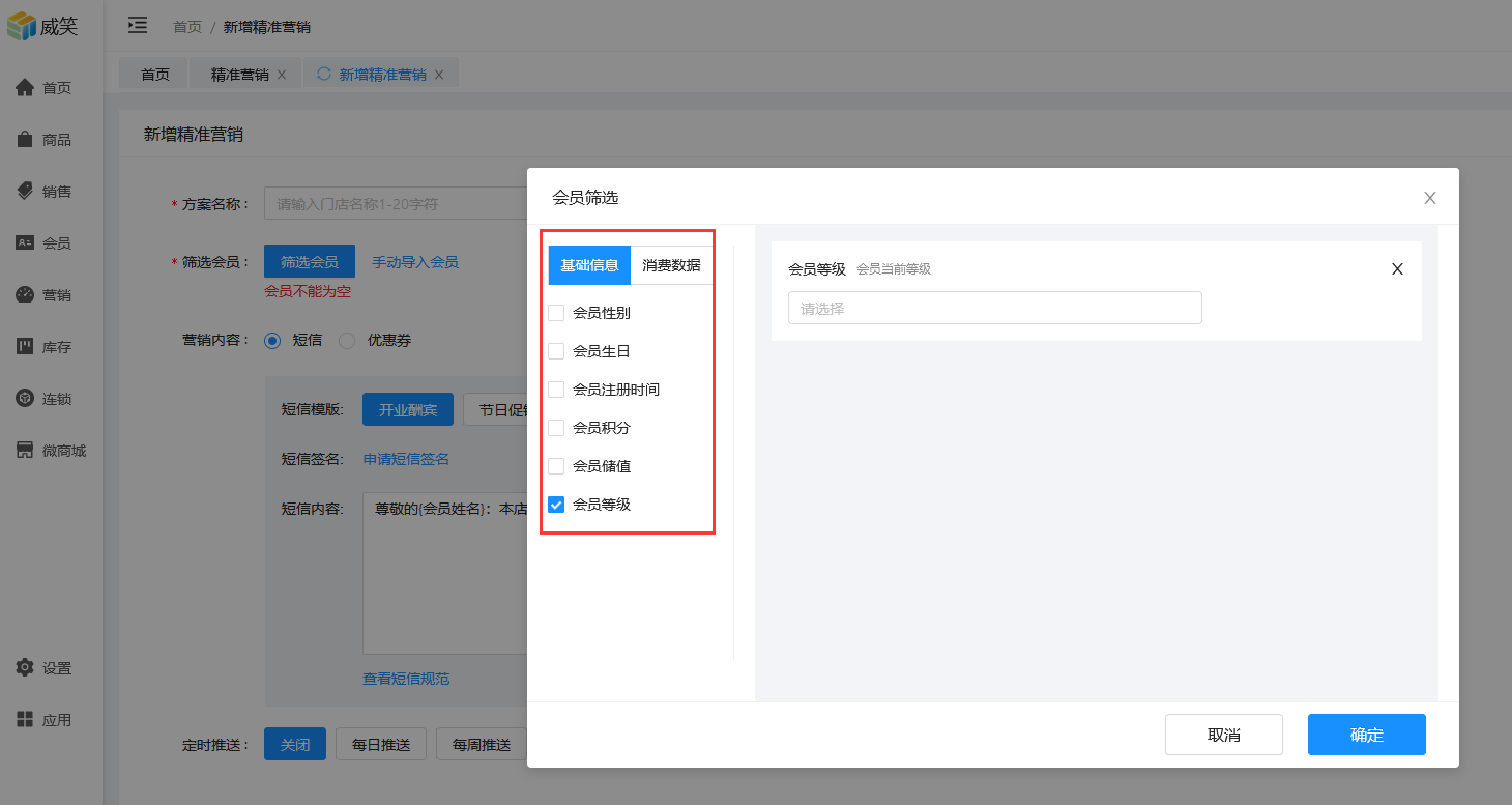 商家可根據(jù)篩選會(huì)員“基礎(chǔ)信息”(如 會(huì)員性別、會(huì)員生日、會(huì)員注冊(cè)時(shí)間、會(huì)員積分、會(huì)員儲(chǔ)值、會(huì)員等級(jí))或:“消費(fèi)數(shù)據(jù)”(如 消費(fèi)數(shù)據(jù)、充值數(shù)據(jù)、售后數(shù)據(jù)、購(gòu)買(mǎi)商品數(shù)據(jù))進(jìn)行做精準(zhǔn)營(yíng)銷(xiāo)活動(dòng)。