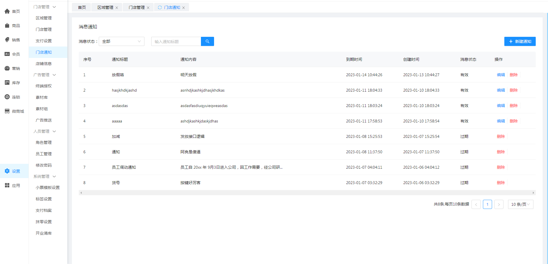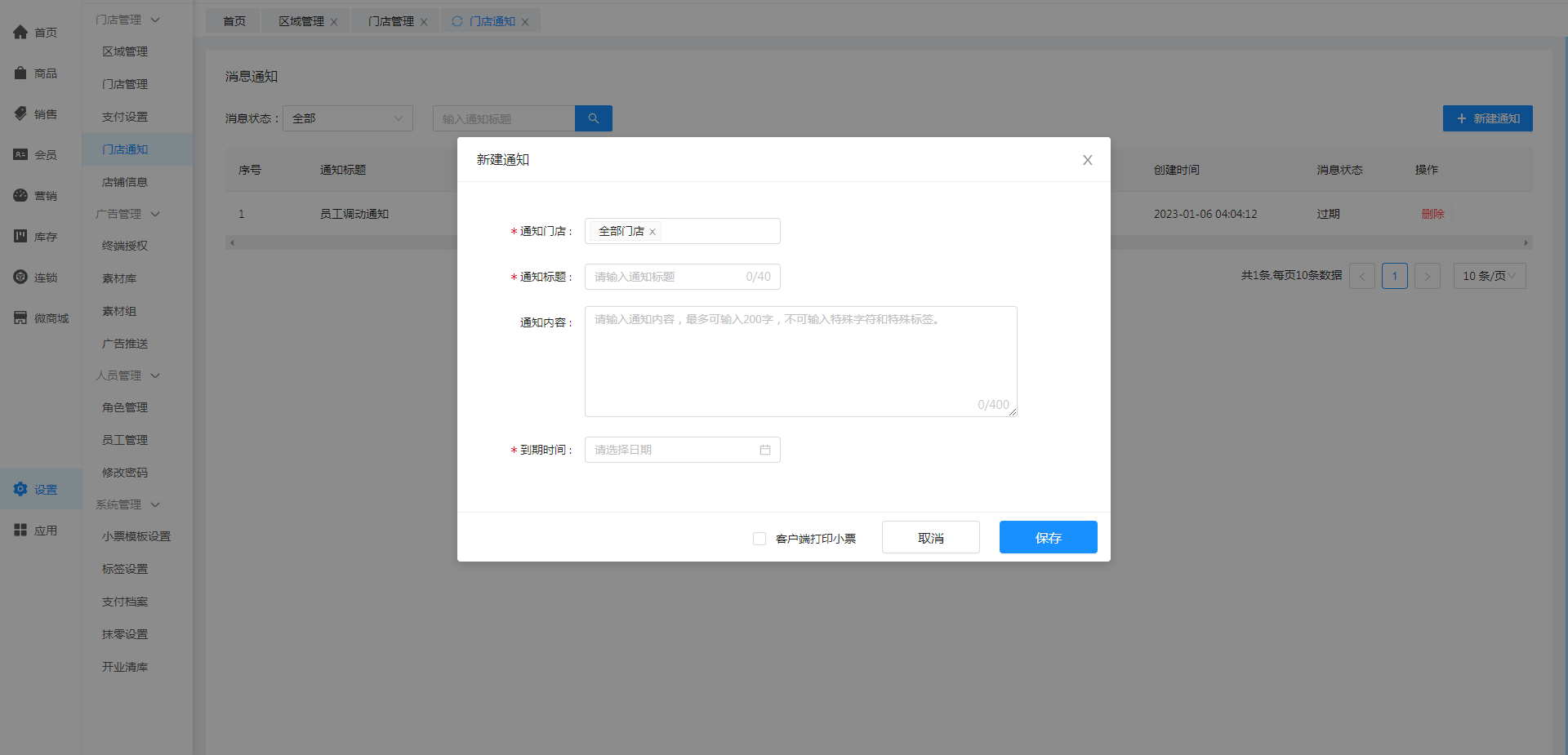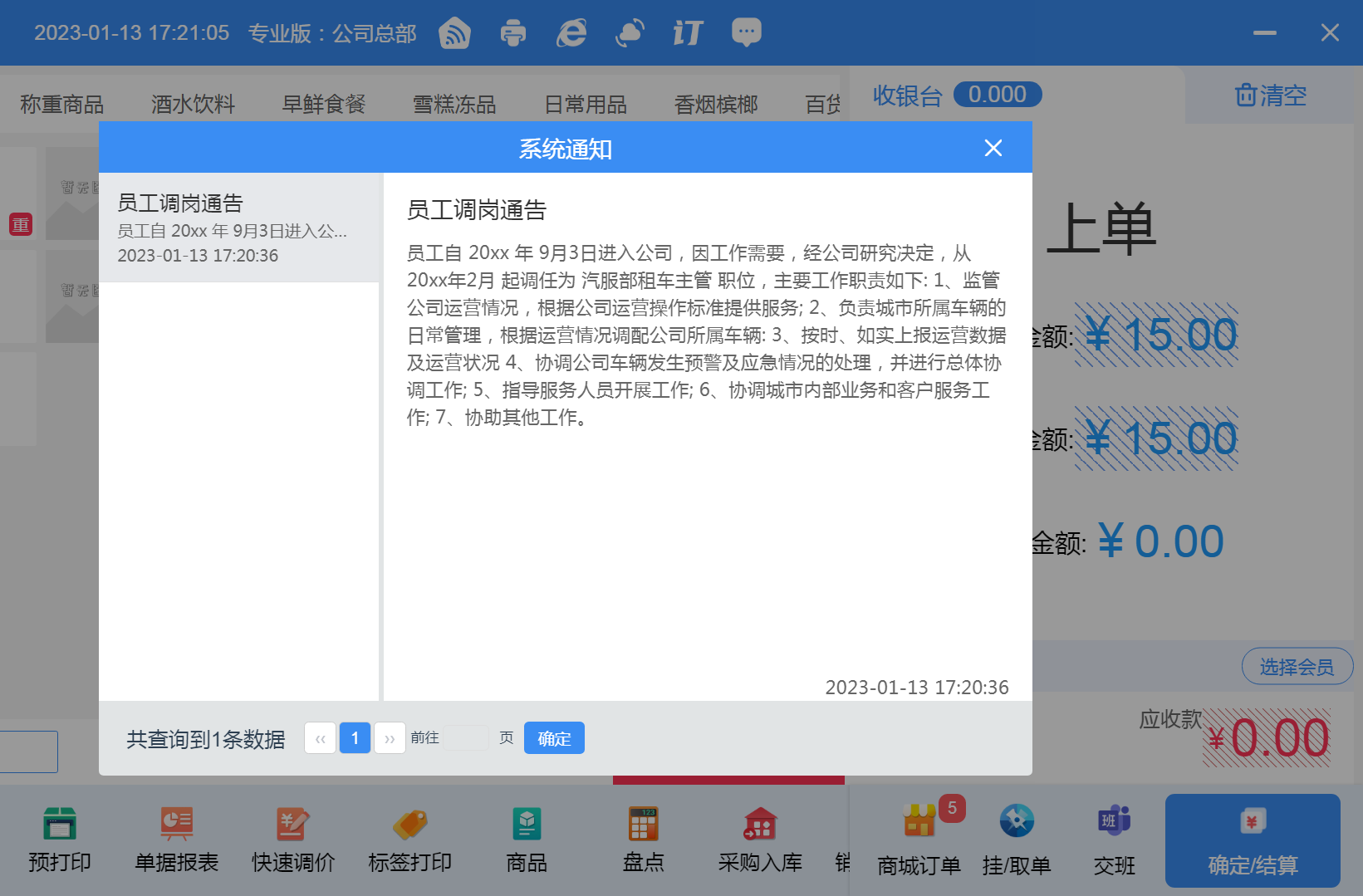 總部可給分店發(fā)送內(nèi)部消息通知,如人員變更、放假通知、會(huì)議通知等。發(fā)送通知后,收銀端和手機(jī)管理后臺(tái)均可查看。