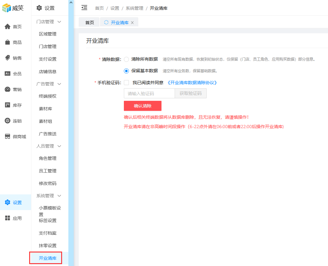 開(kāi)業(yè)清庫(kù)可選擇“清除所有數(shù)據(jù)”或“保留基本數(shù)據(jù)”,為了保障數(shù)據(jù)安全,刪除數(shù)據(jù)時(shí)設(shè)置了需要有手機(jī)驗(yàn)證碼才能刪除。