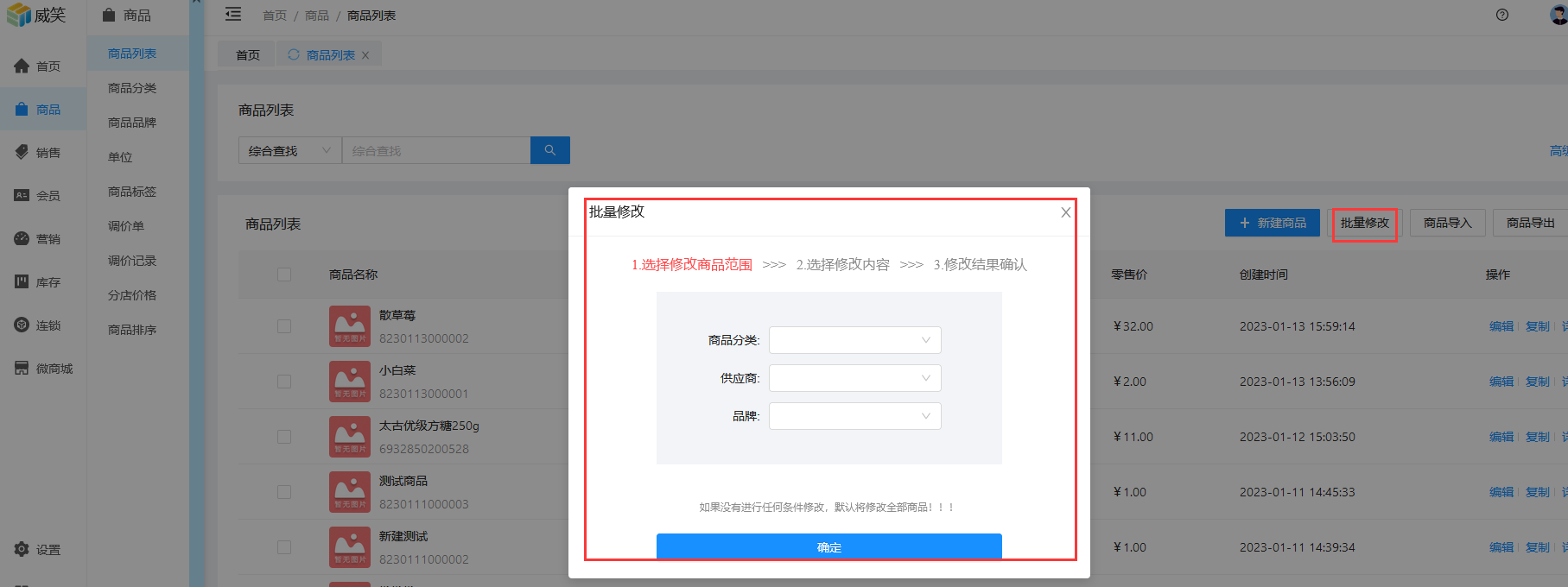 在系統(tǒng)后臺(tái)“商品列表”里新增了“批量修改”功能,商戶(hù)可根據(jù)“商品分類(lèi)”、“供應(yīng)商”、“品牌”快速做商品檔案整理。