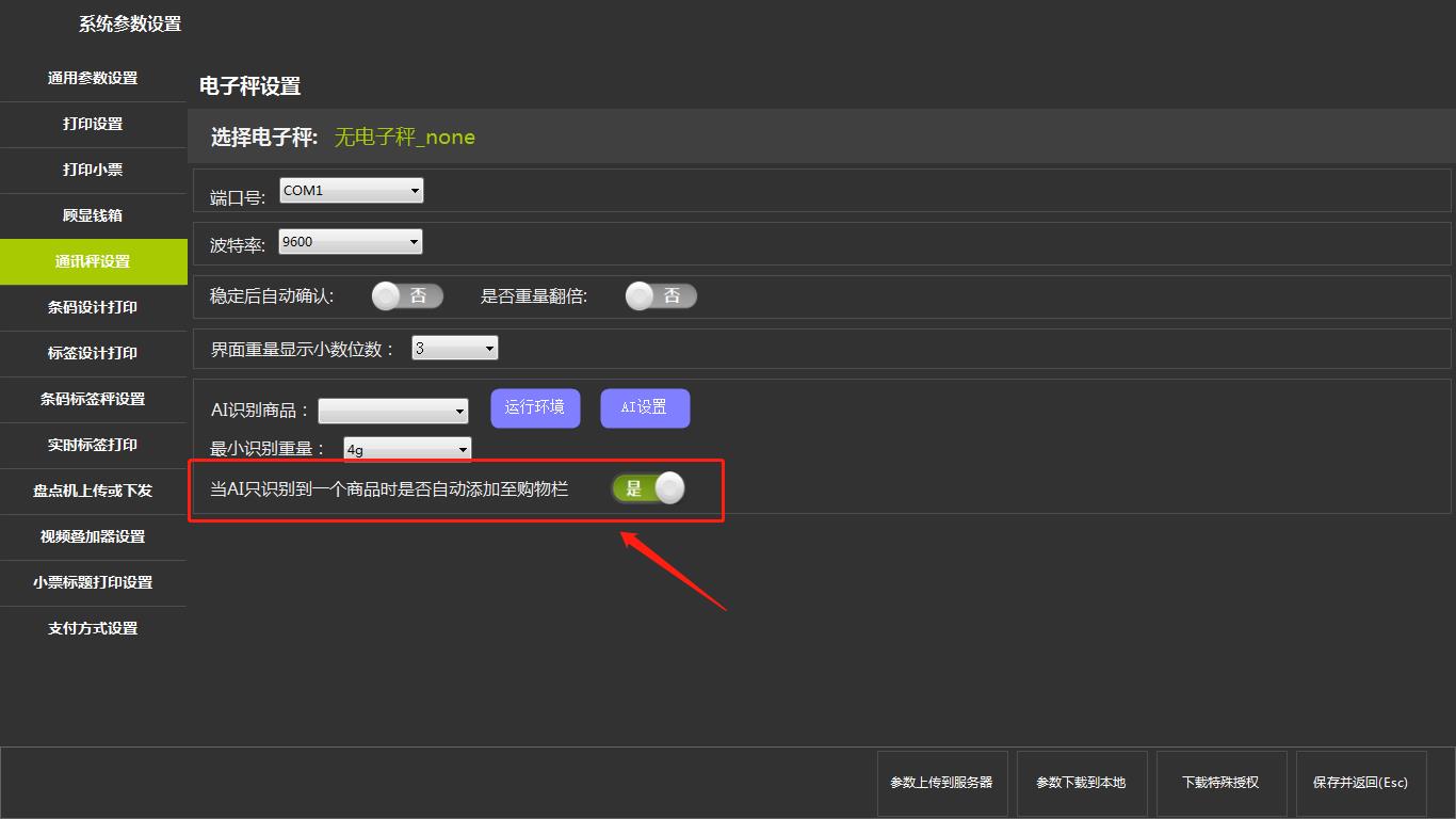 威云SaaS前臺(tái)通訊秤設(shè)置增加了當(dāng)AI只識(shí)別到一個(gè)商品時(shí)是否自動(dòng)添加至購(gòu)物欄的參數(shù)功能