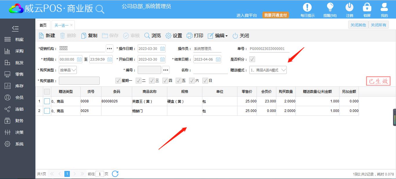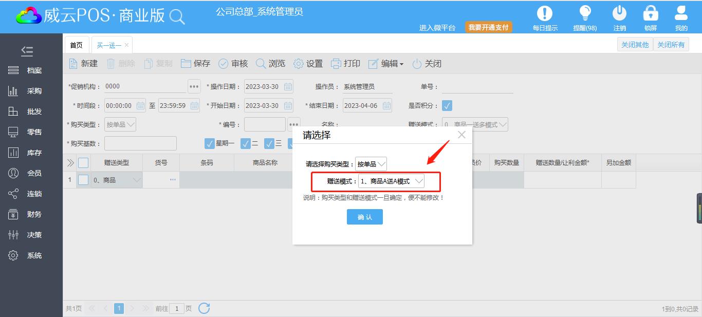 威云SaaS前臺(tái)買一送一促銷增加了買A送A模式的功能。注:此功能需要開啟促銷新算法才會(huì)生效