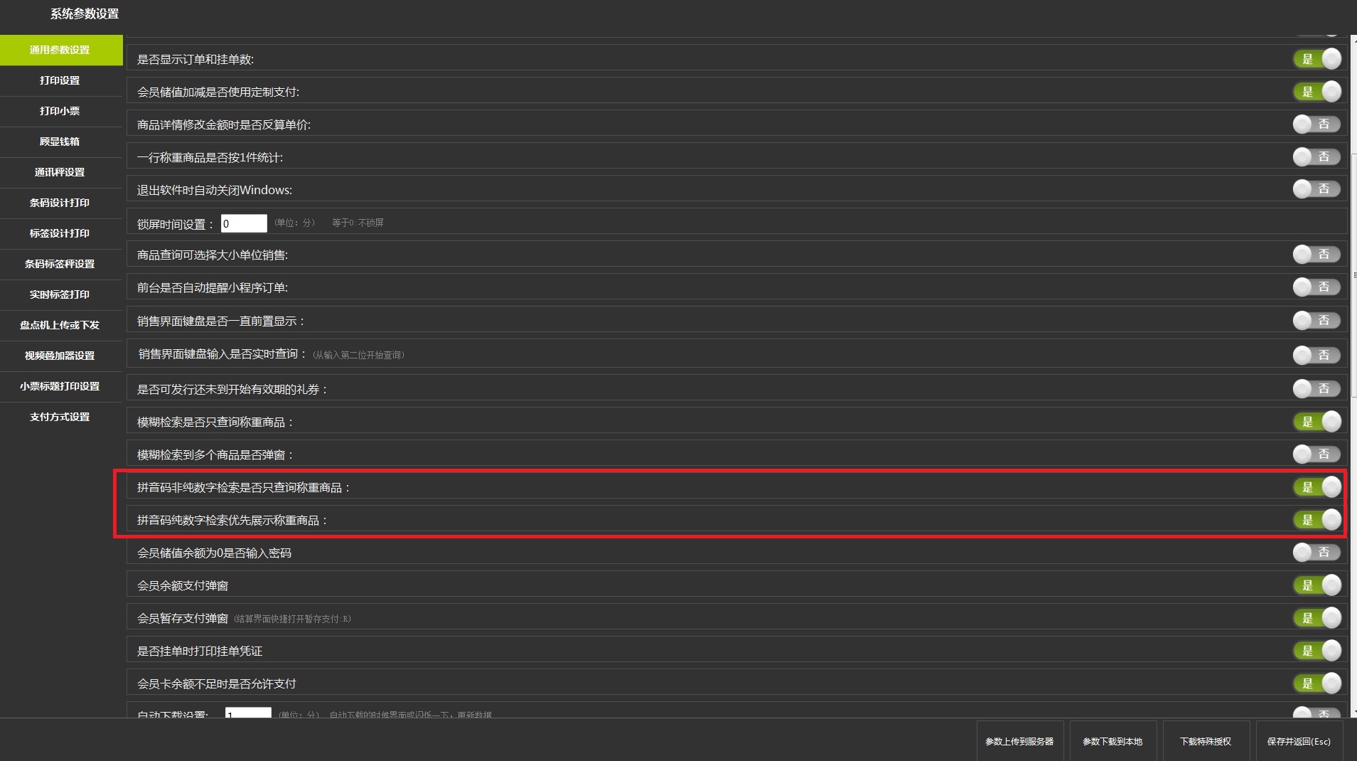 威云SaaS前臺(tái)系統(tǒng)通用參數(shù)增加了拼音碼非純數(shù)字檢索是否只查詢稱重商品和拼音碼純數(shù)字檢索優(yōu)先展示稱重商品的參數(shù)功能。(備注:此參數(shù)都是運(yùn)用到拼音碼功能)