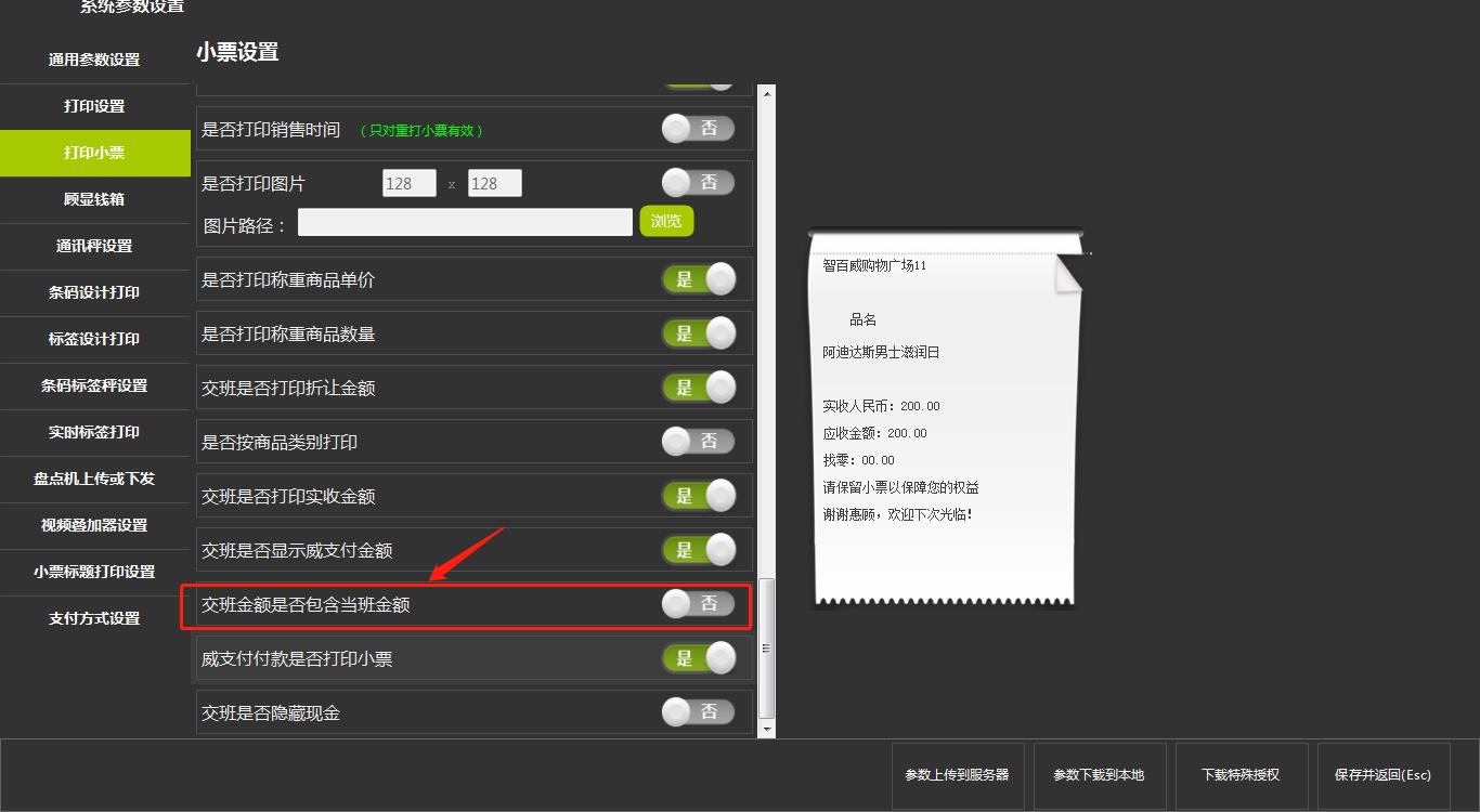 威云SaaS前臺(tái)打印小票設(shè)置增加了交班金額是否包含當(dāng)班金額的參數(shù)功能