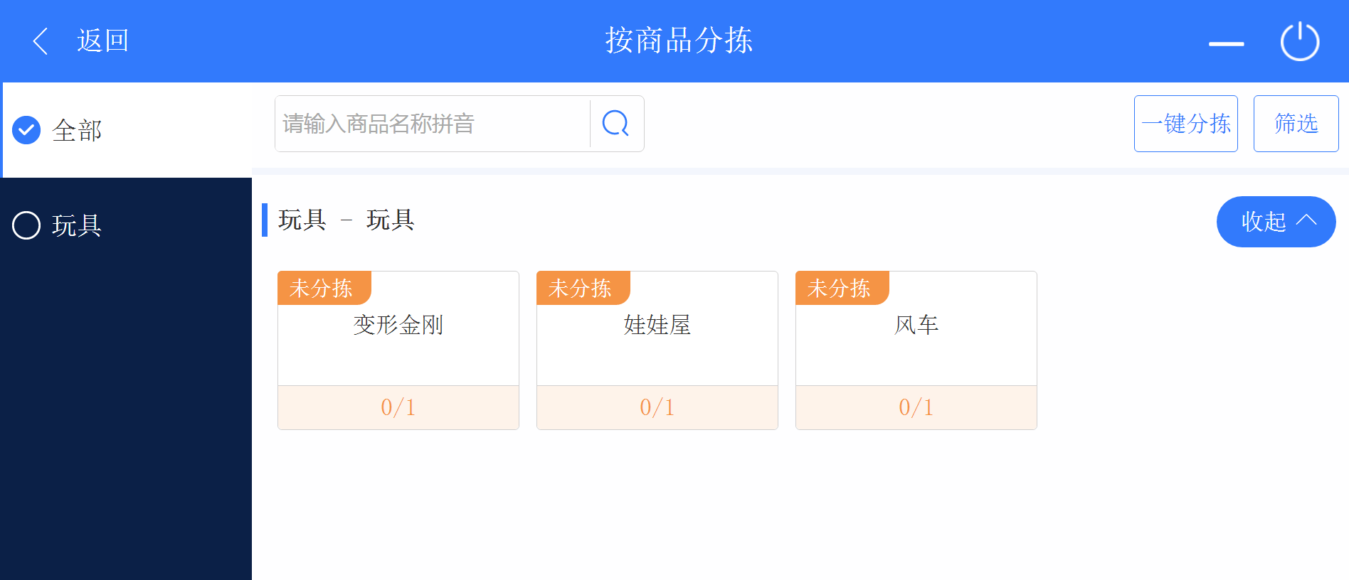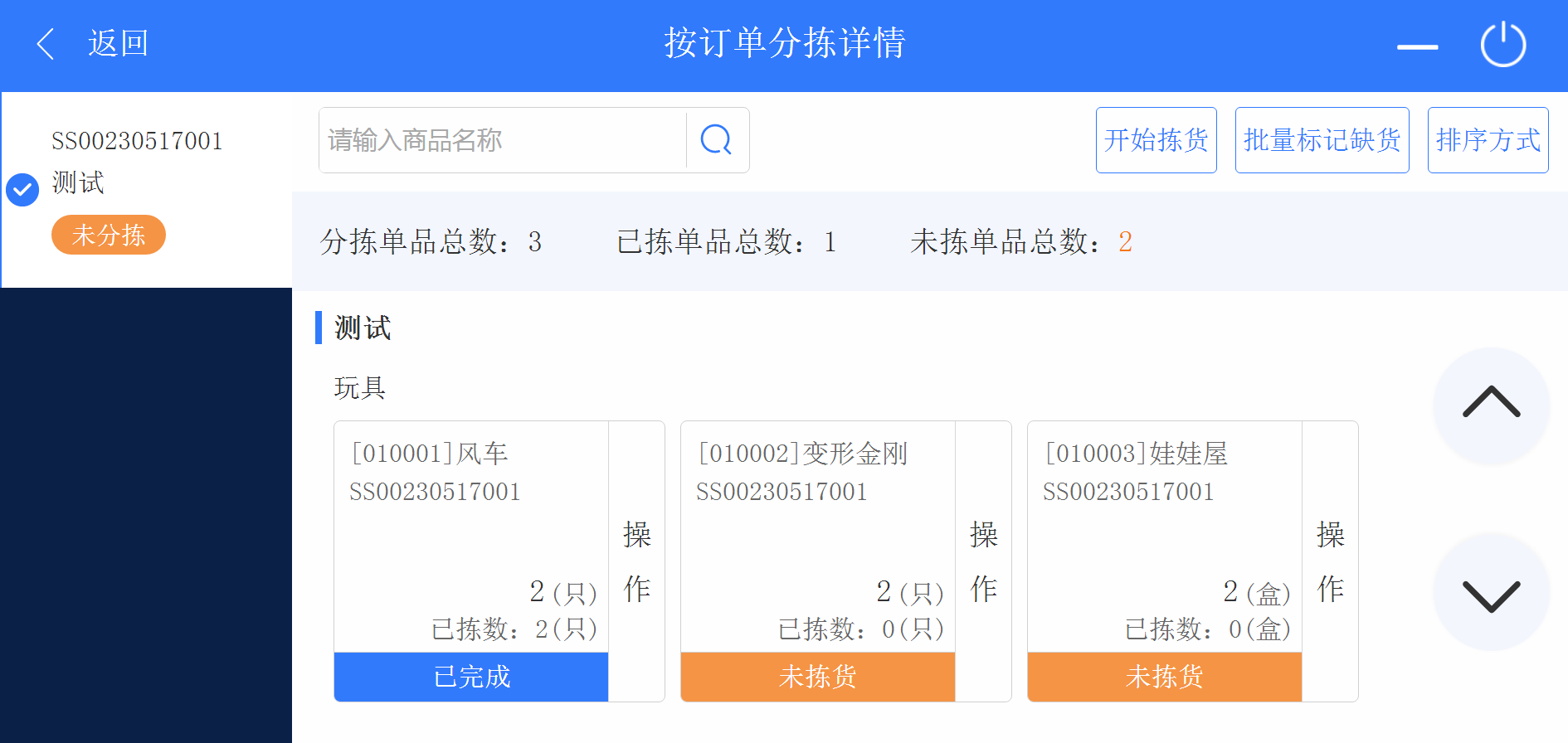 2. 進(jìn)入wms系統(tǒng),點擊進(jìn)入按商品揀貨頁面,可以點擊商品進(jìn)入按商品分揀詳情頁面進(jìn)行揀貨。也可以點擊一鍵分揀按鈕進(jìn)入一鍵分揀狀態(tài),勾選需要分揀的商品,點擊一鍵分揀對已選商品進(jìn)行揀貨。揀貨后可以點擊打印進(jìn)行單品標(biāo)簽的打印。