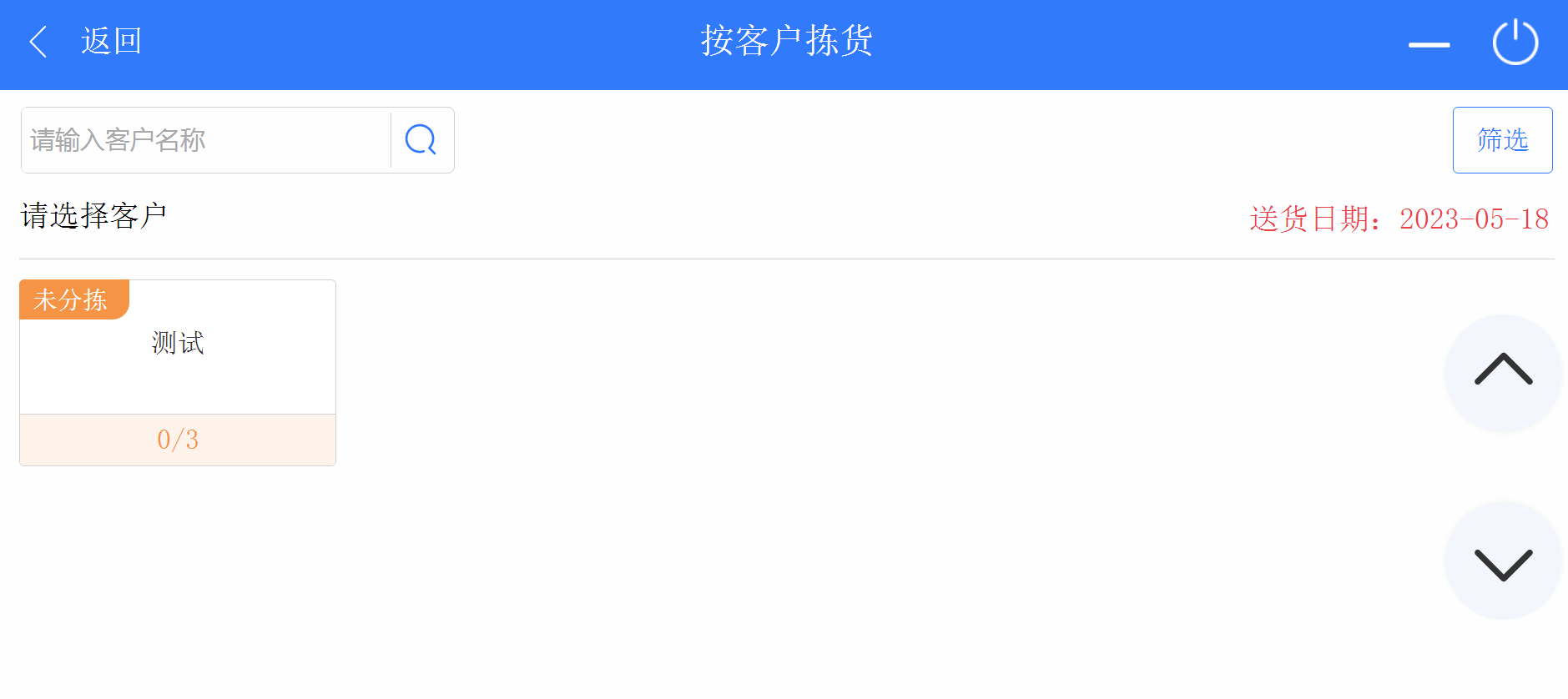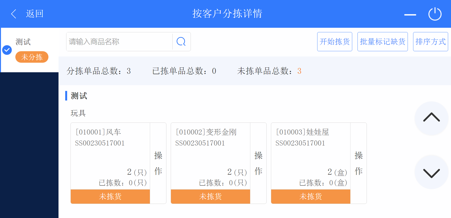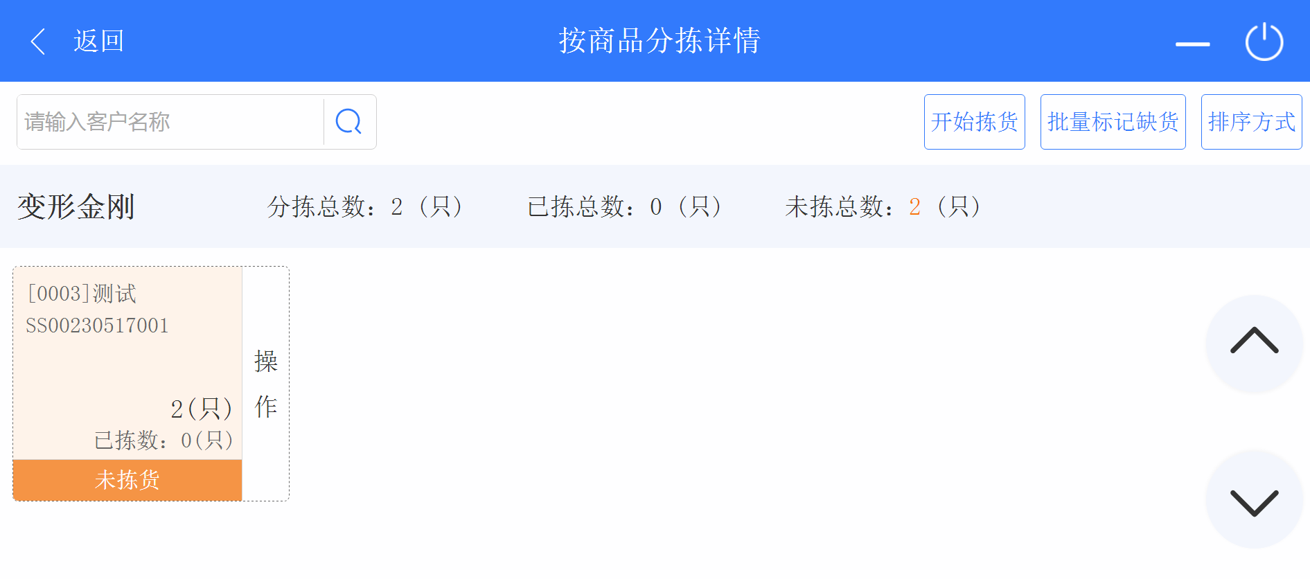 3. 返回首頁,點擊進(jìn)入按商戶揀貨頁面,可以看到需要分揀的商戶,點擊商戶進(jìn)入按客戶分揀詳情頁面。點擊操作對商品進(jìn)行揀貨、打印、標(biāo)記缺貨等工作。
