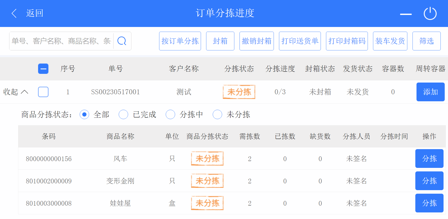 4. 返回首頁,點擊進(jìn)入訂單分揀進(jìn)度,可看到當(dāng)前的訂單情況。在此頁面,可以勾選未分揀、分揀中的訂單點擊按鈕進(jìn)入按訂單分揀頁面,對各個訂單的商品進(jìn)行揀貨。也可以在訂單分揀進(jìn)度頁面對訂單進(jìn)行揀貨、添加周轉(zhuǎn)容器,給分揀完成的訂單進(jìn)行封箱、打印封箱碼、裝車發(fā)貨、打印發(fā)貨單等操作。