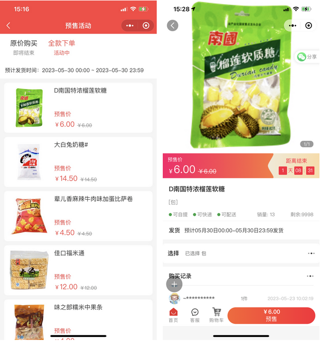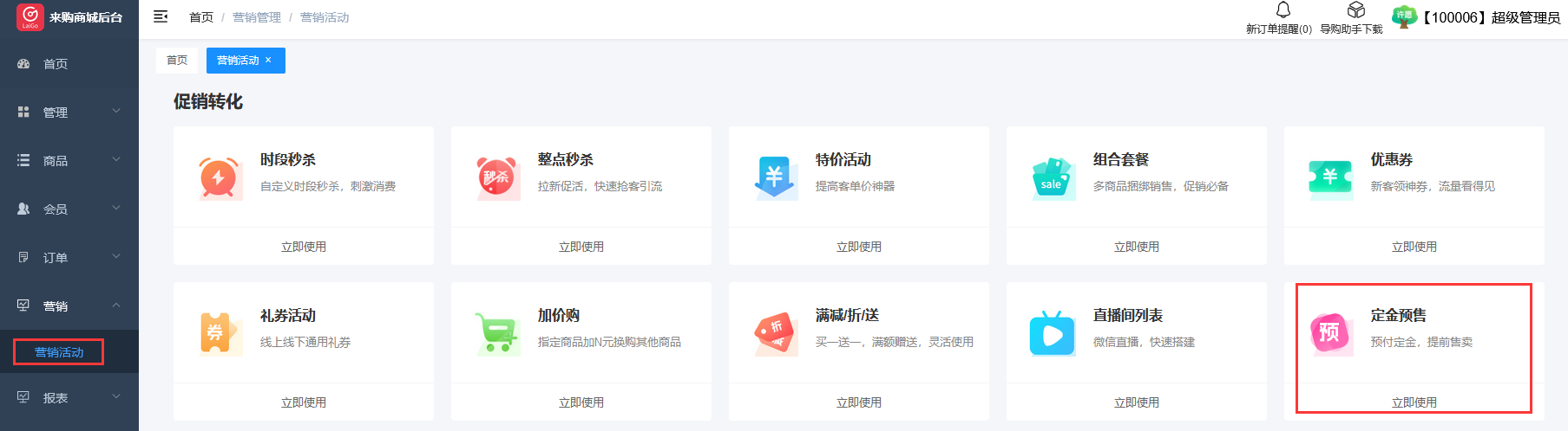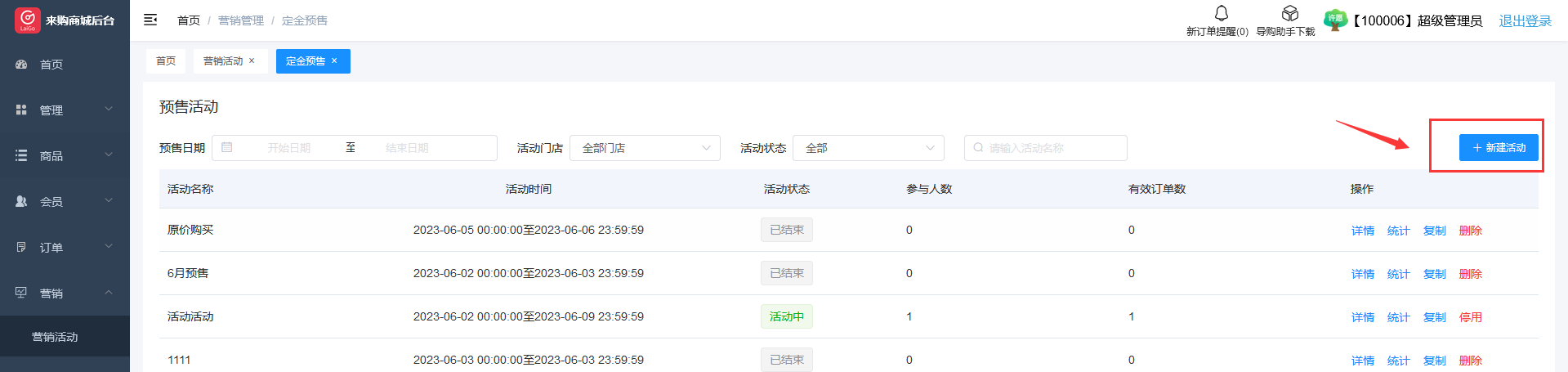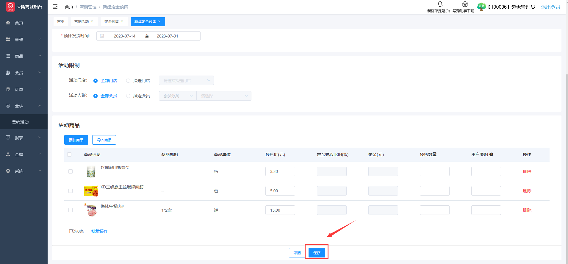 【活動名稱】:本次活動的名稱設(shè)置【批量操作】:可批量設(shè)置預(yù)售價、定金、預(yù)售數(shù)量、用戶限購