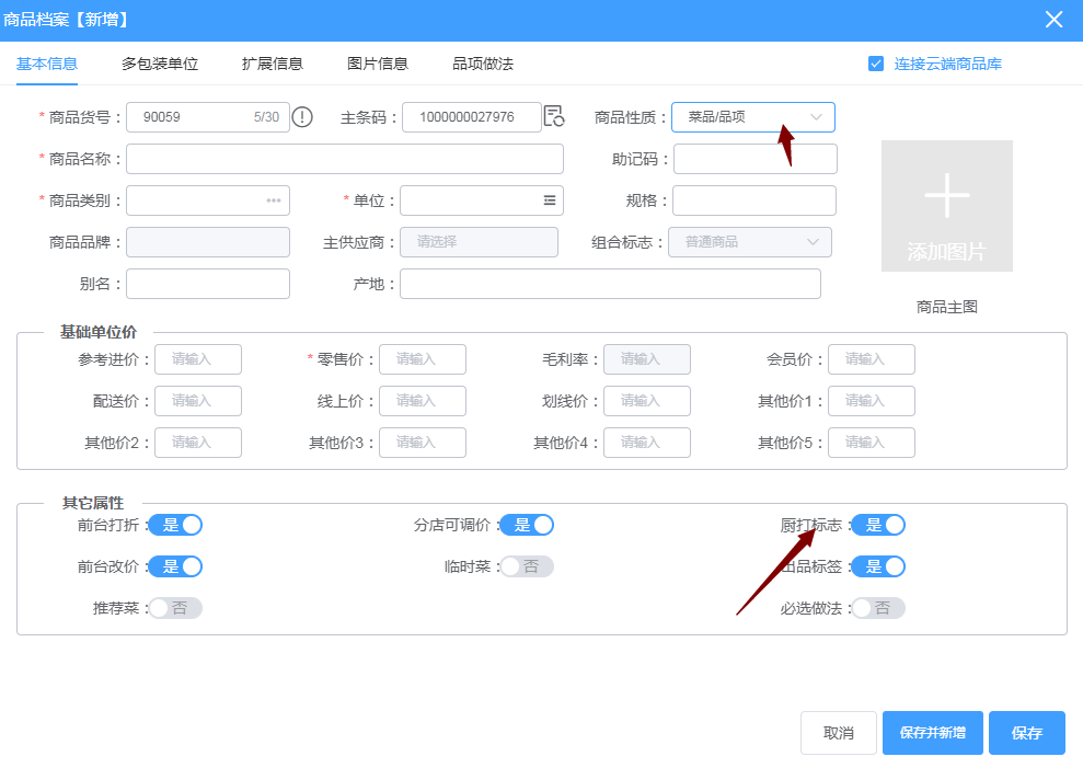 在“商品性質(zhì)”里將菜品選擇“普通商品” 或者選“菜品/品項(xiàng)” ,并且商品屬性設(shè)置成,“廚打標(biāo)志=是”