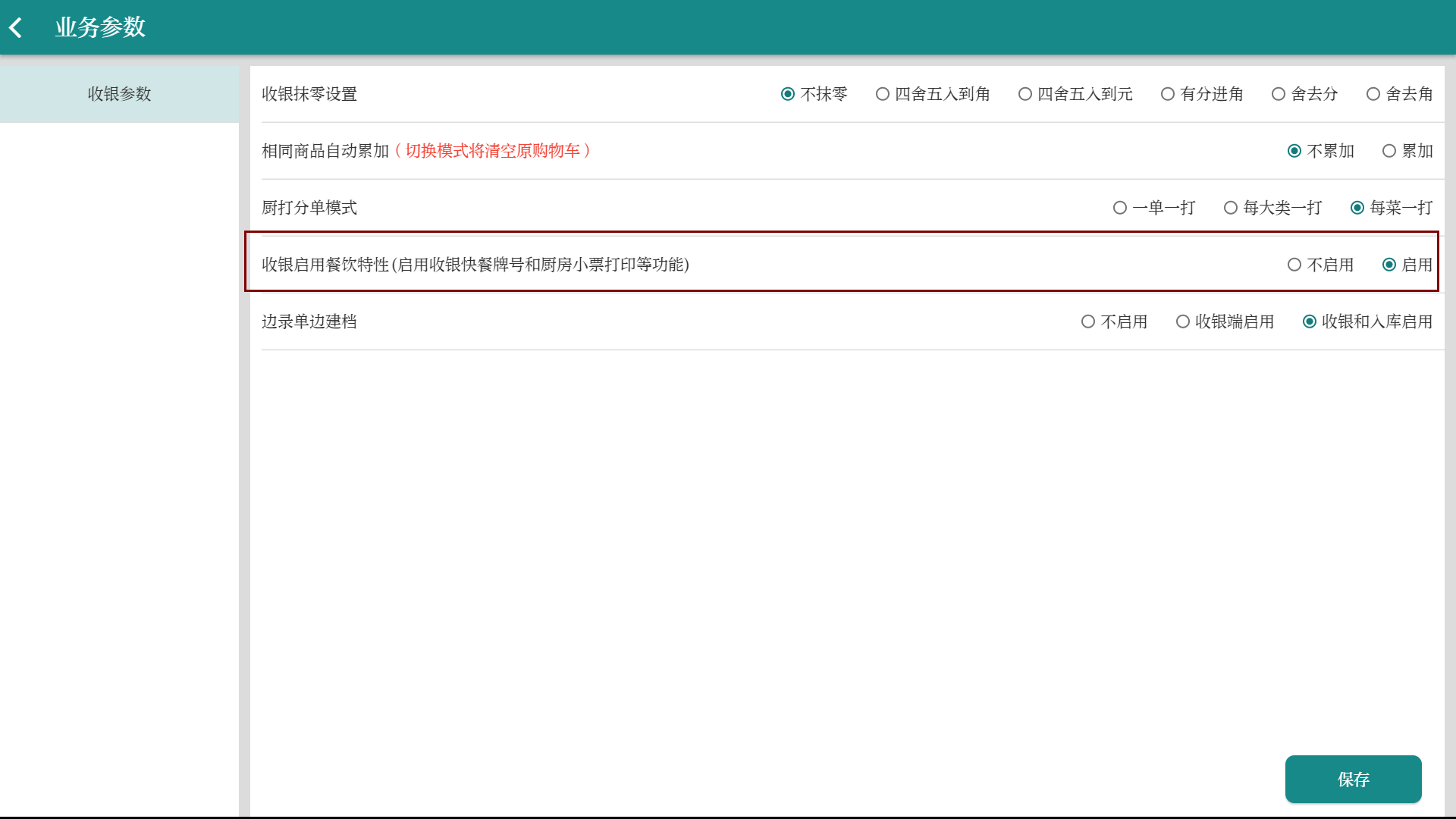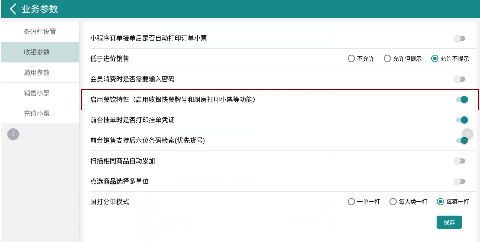 先開(kāi)啟餐飲特性,參數(shù)在【更多功能-業(yè)務(wù)參數(shù):收銀啟用餐飲特性】