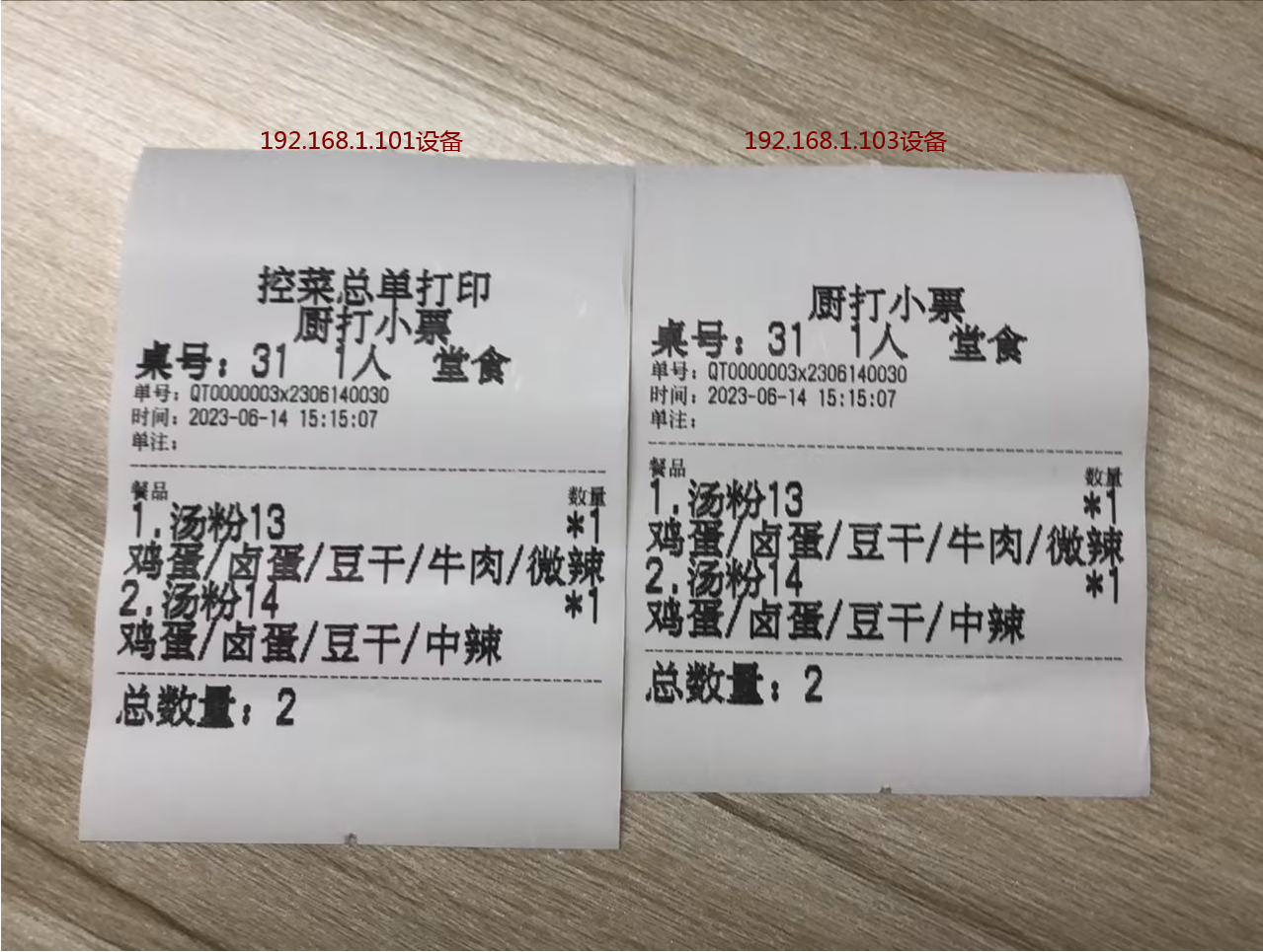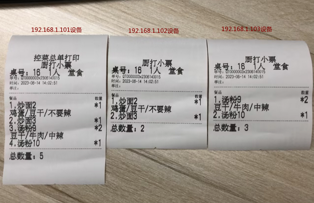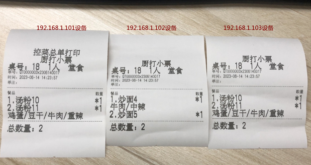 結(jié)算后,打印兩張廚打小票(控菜總單不打印“炒面類”方案里的菜品 ,炒面類分單小票不打印,湯粉類分單小票照常打?。?/span>