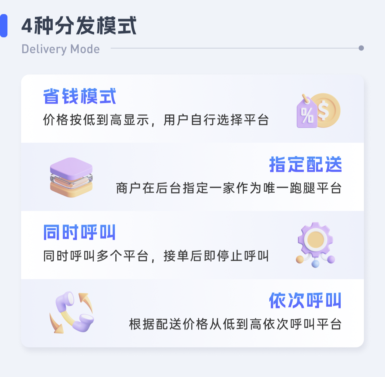 - 同時呼叫:同時呼叫支持的所有配送平臺,某平臺接單后其他平臺自動取消;