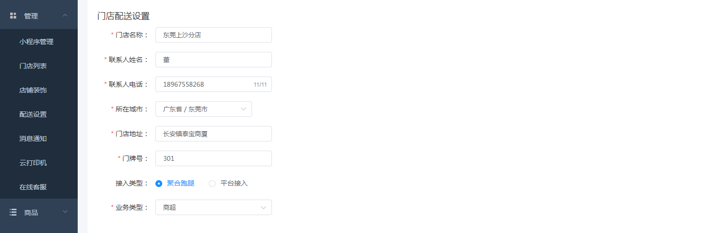 點擊下方設(shè)置,跳轉(zhuǎn)“門店配送設(shè)置頁面”,填寫配送信息