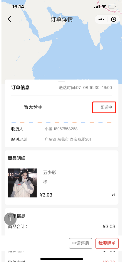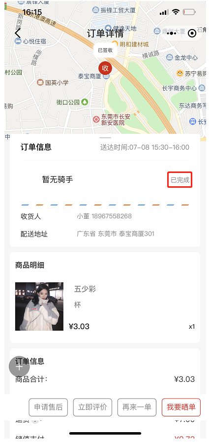 配送員取貨后,顯示“配送中”;送達(dá)之后顯示“已完成”
