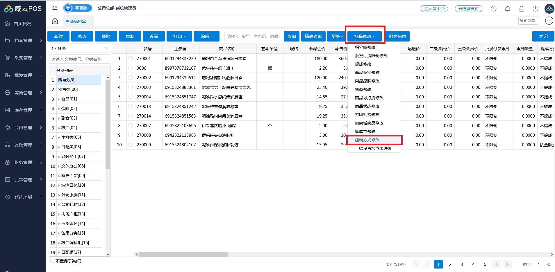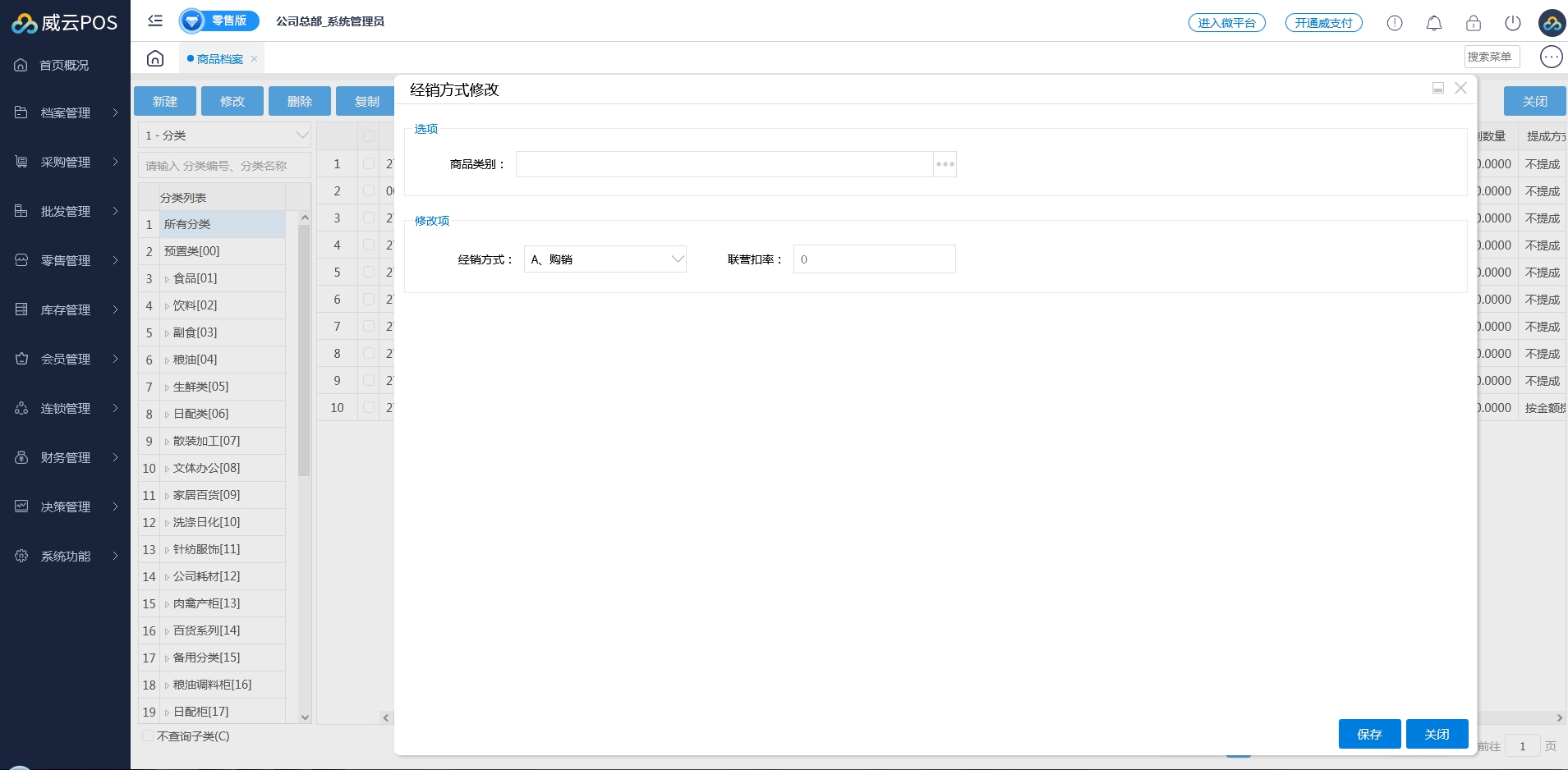 06. 威云后臺(tái)商品檔案增加經(jīng)銷方式以及聯(lián)營(yíng)扣點(diǎn)批量修改的功能