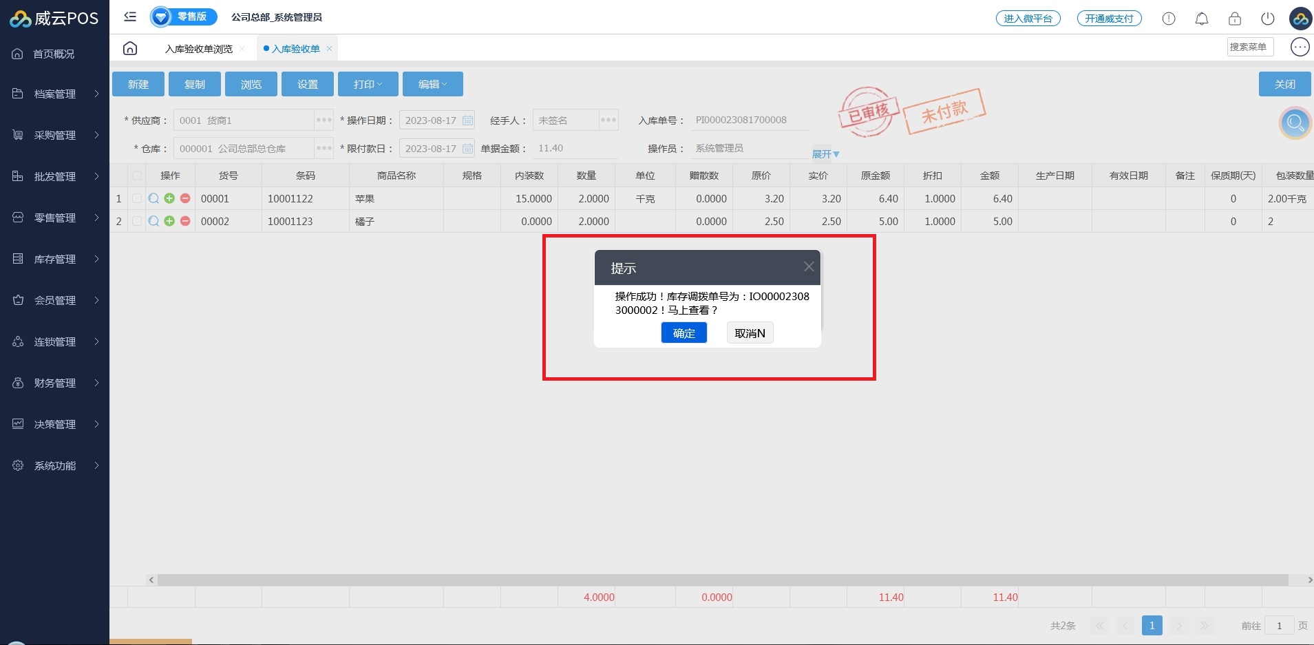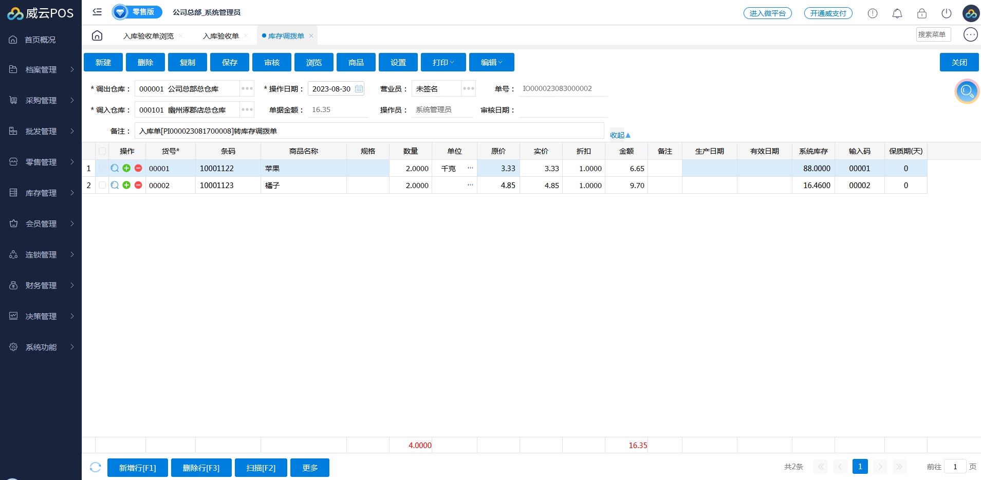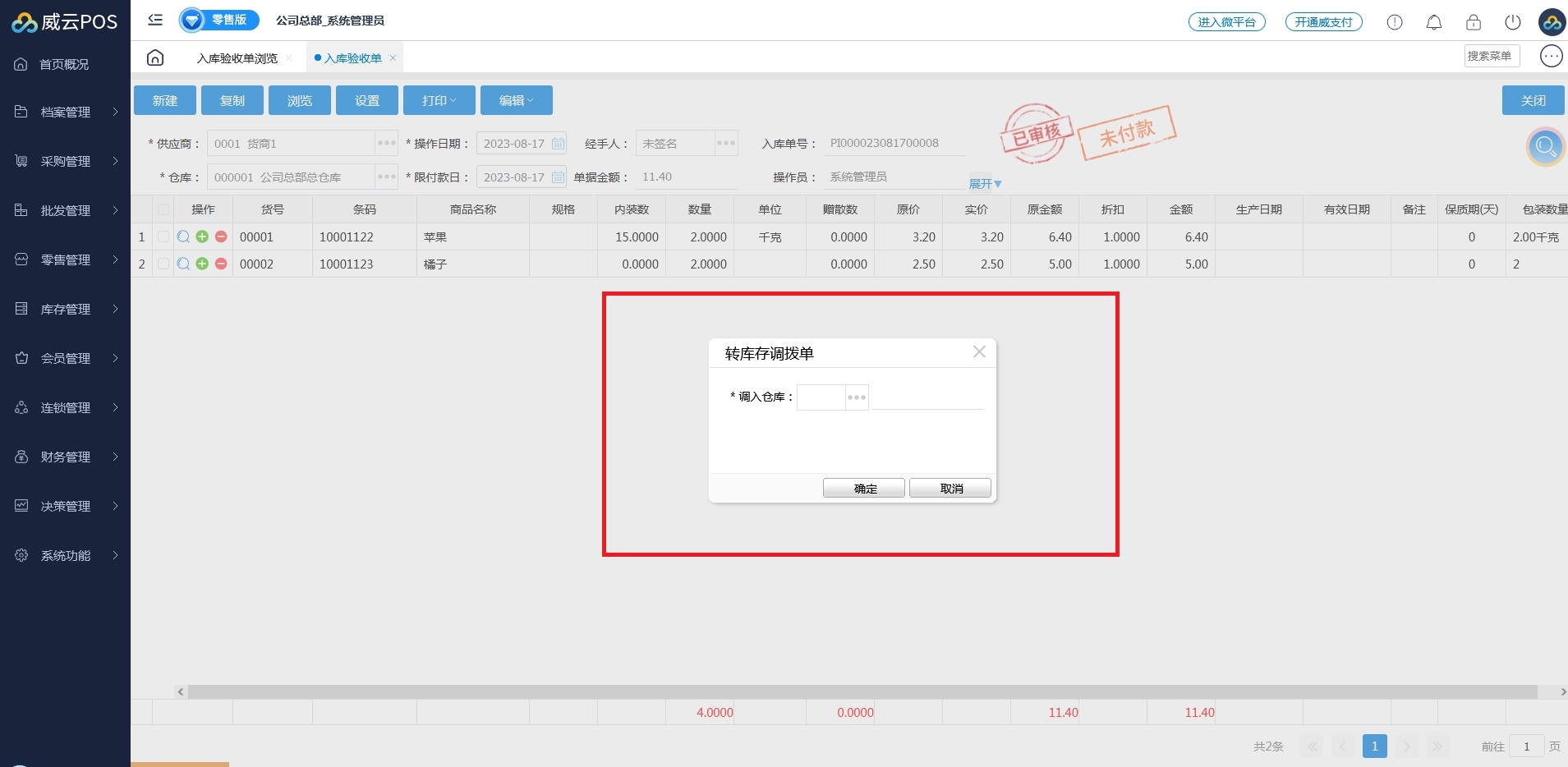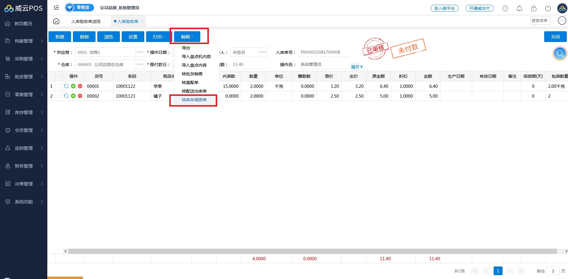 07. 威云后臺(tái)入庫驗(yàn)收單編輯導(dǎo)出下拉菜單增加了轉(zhuǎn)庫存調(diào)撥單的功能
